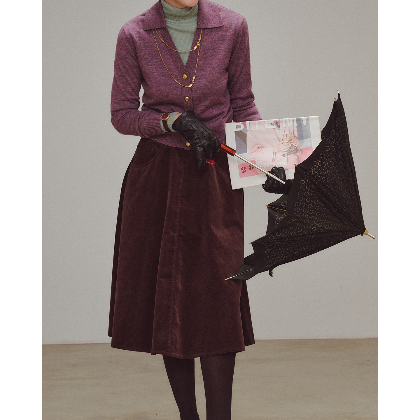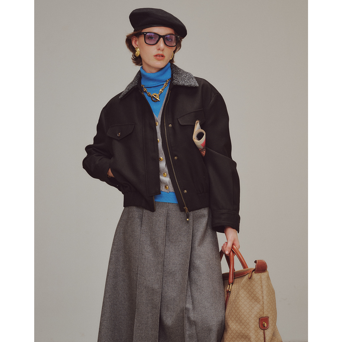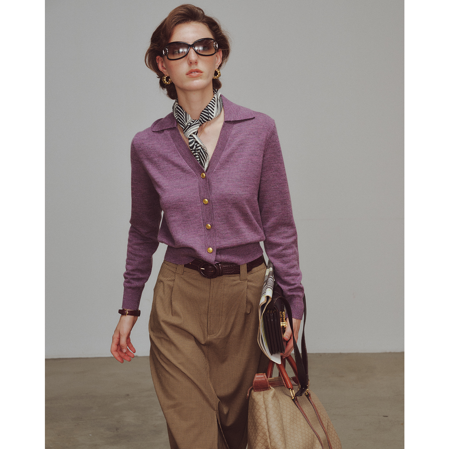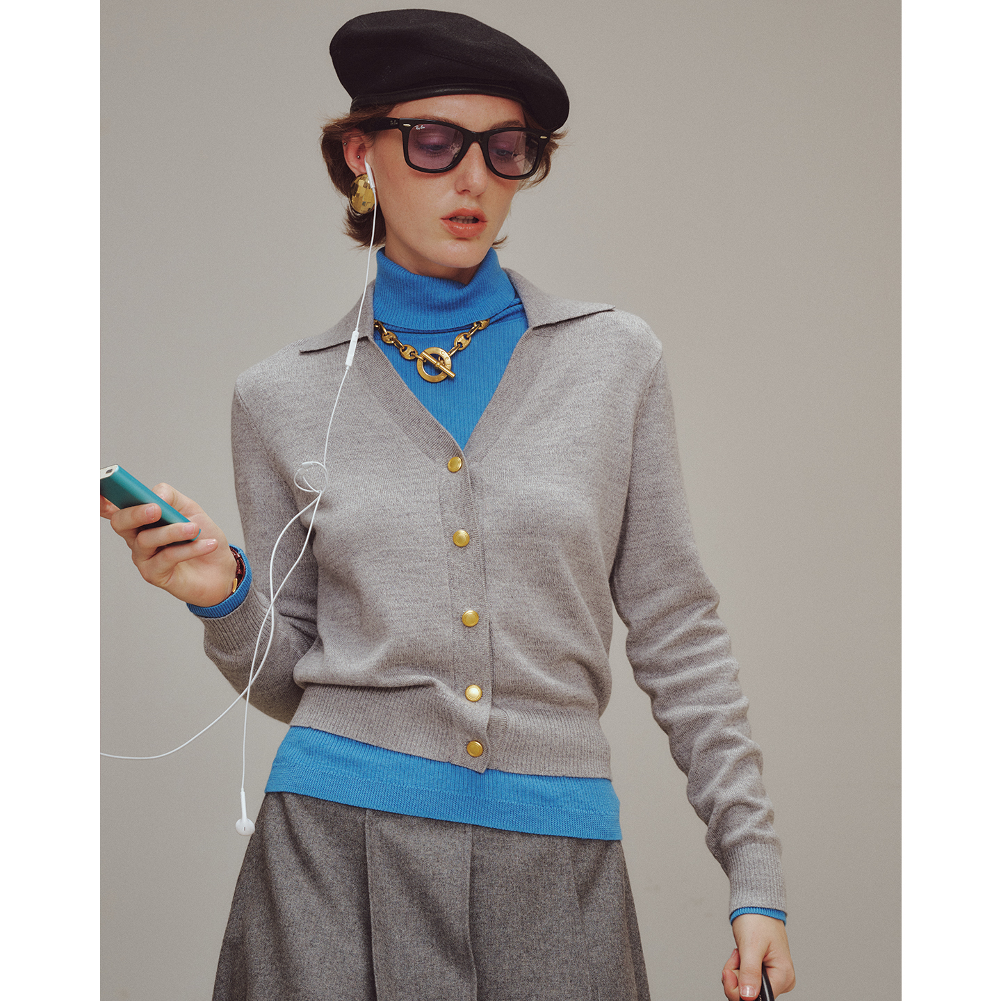 三所vintage polo方领超细100%羊毛针织开衫修身短款复古金扣毛衣