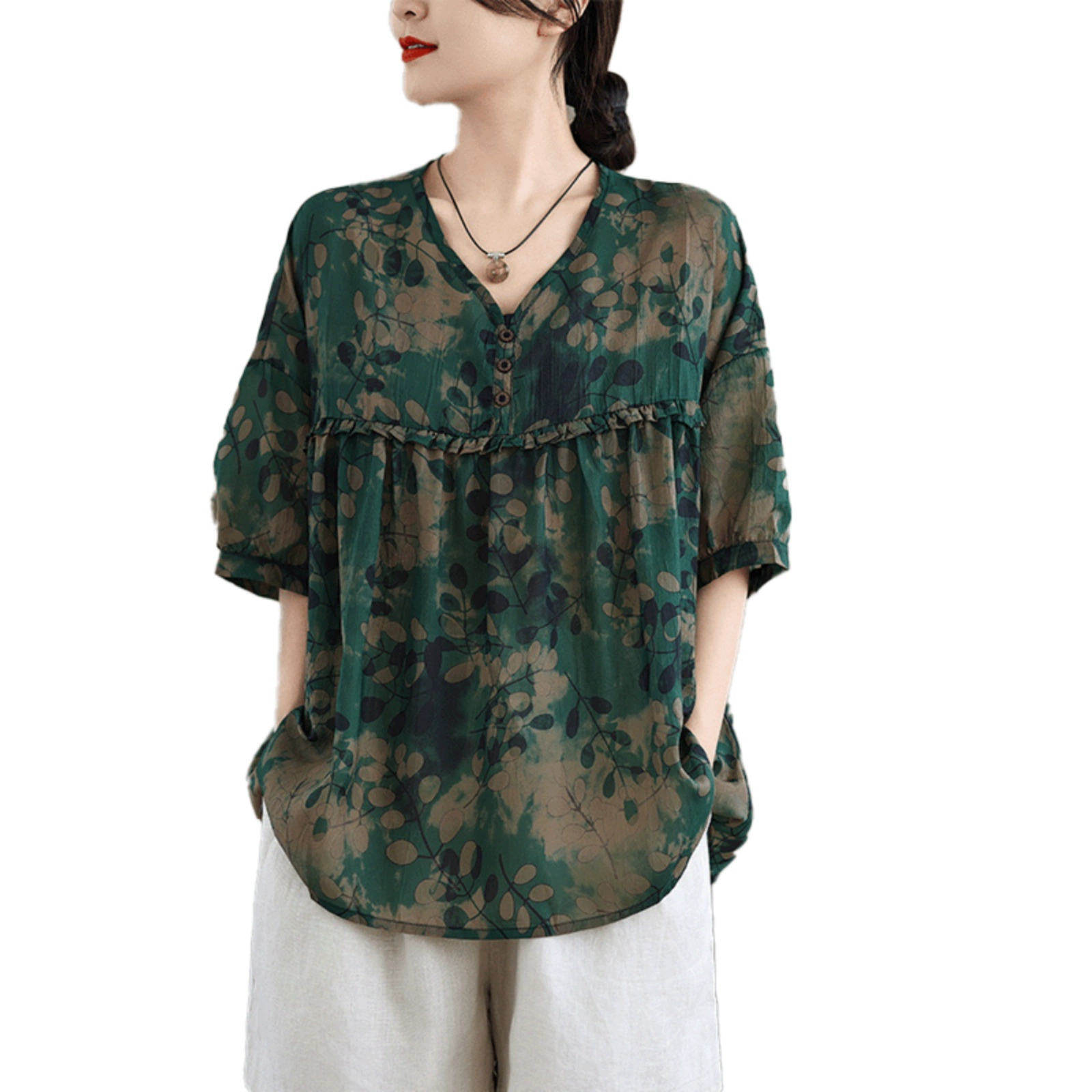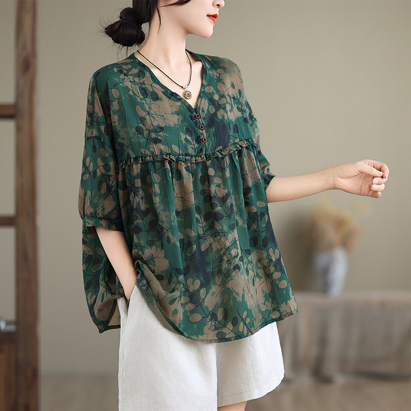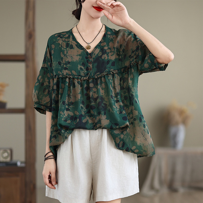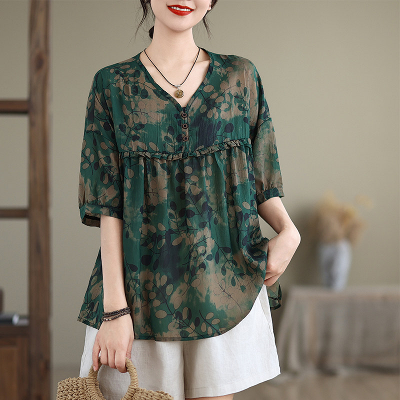 欧货大码短袖t恤女夏季2025新款碎花中袖v领上衣遮肚子显瘦雪纺衫