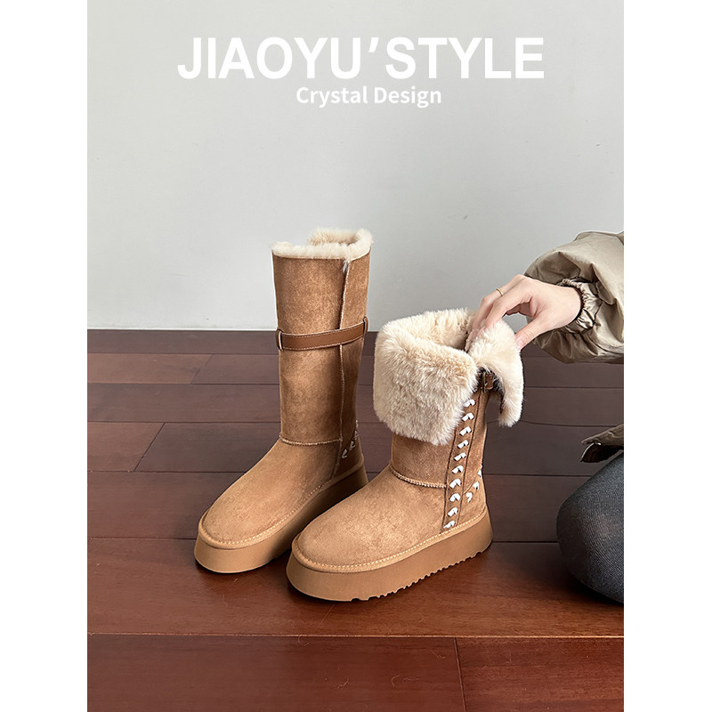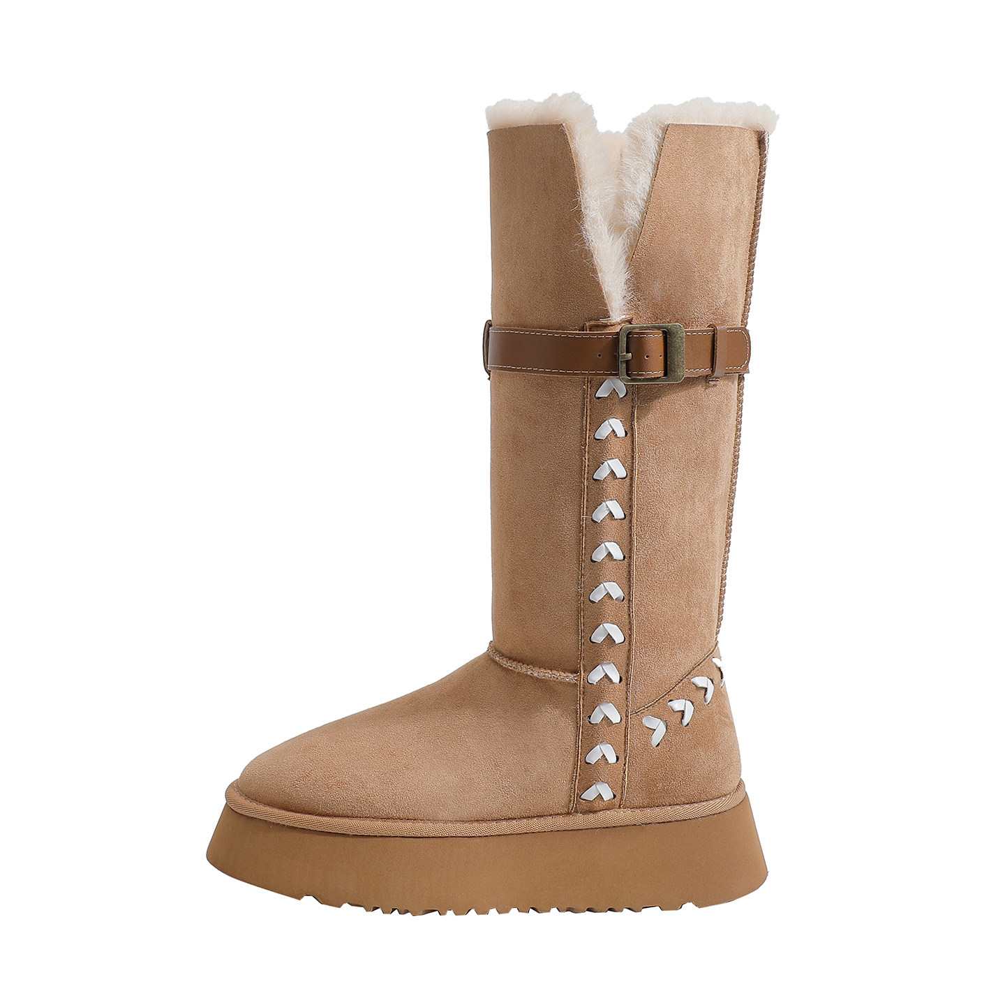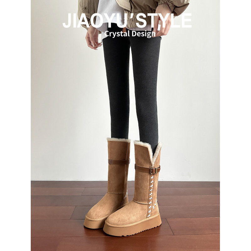 真皮~骄屿厚底雪地靴冬季新款两穿皮带扣长筒靴加绒加厚保暖棉靴