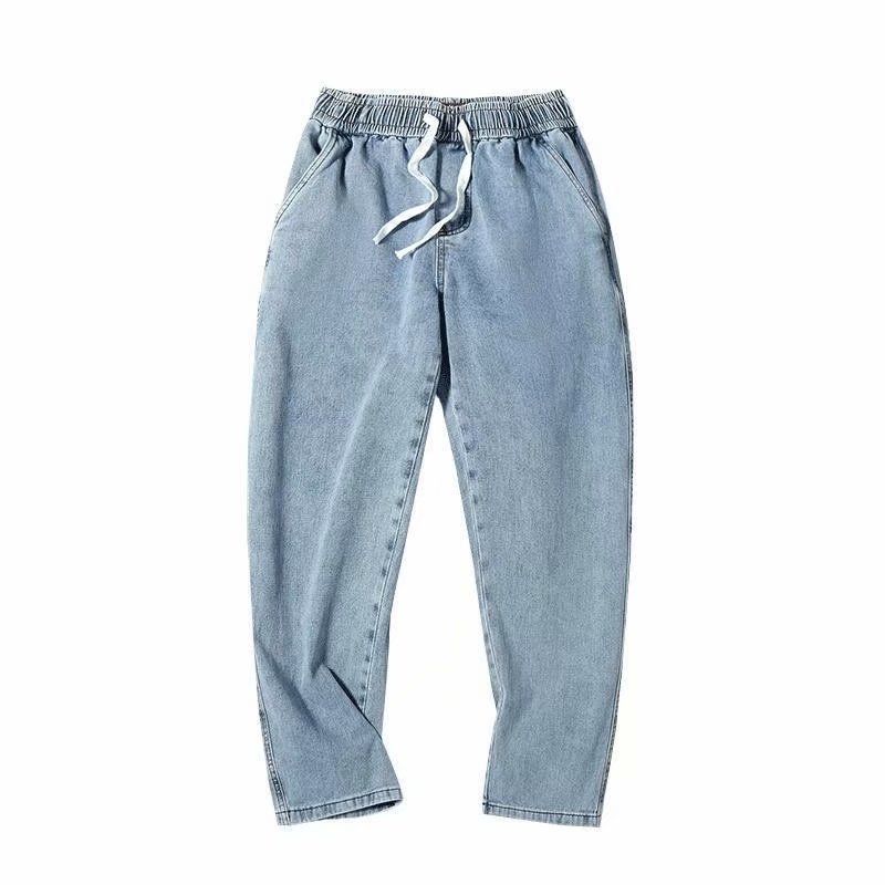 复古浅色松紧腰牛仔裤男夏季薄款直筒宽松九分裤休闲阔腿老爹裤子