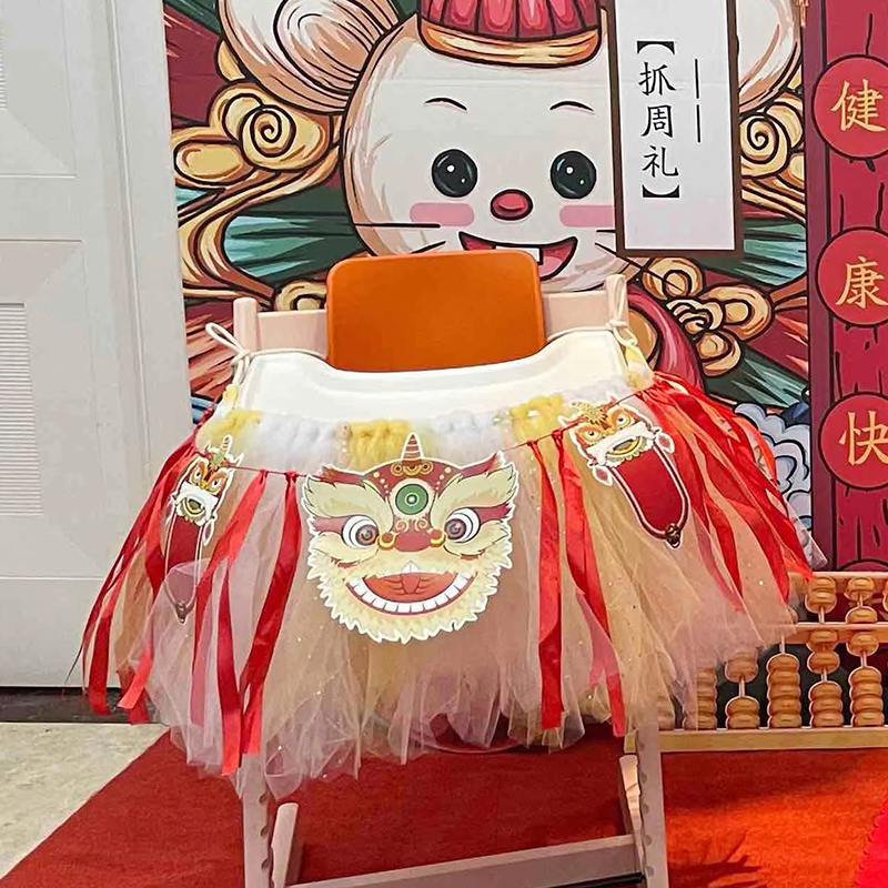 宝宝椅拉旗周岁生日布置装饰餐椅拉花中式创意国潮醒狮红色纸扇花