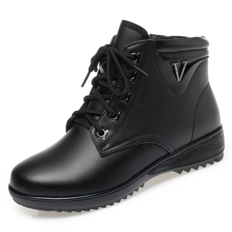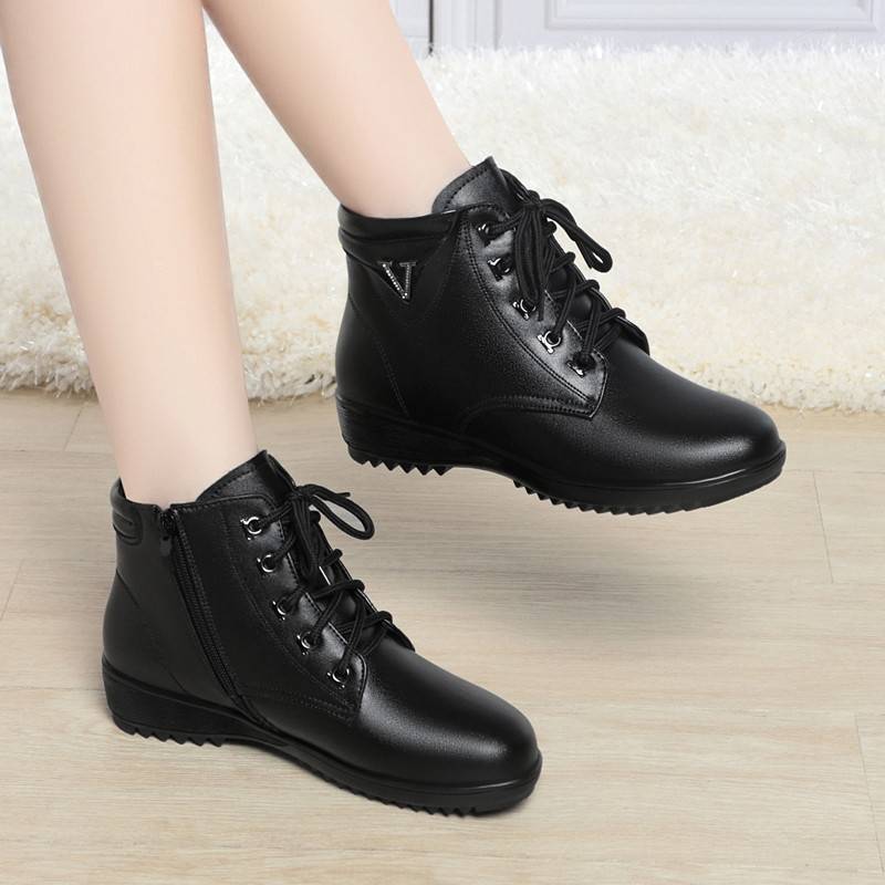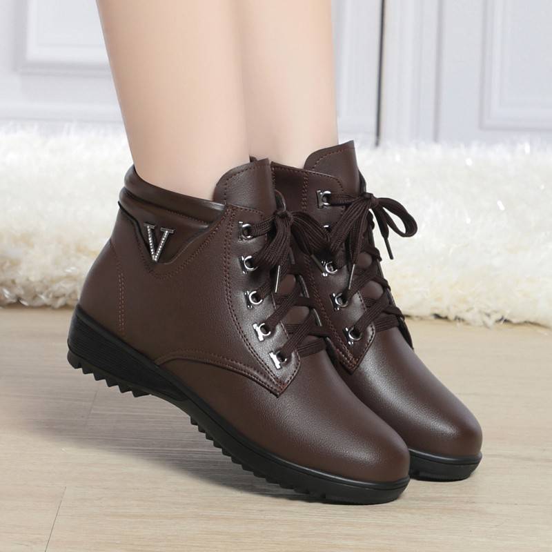 真皮妈妈鞋子女冬季款加绒女鞋皮鞋短靴防滑保暖女靴中老年人棉鞋
