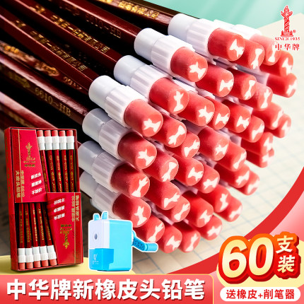正品中华牌铅笔HB小学生一年级二年级专用六角杆考试儿童初学者无铅无毒绘图素描大头橡皮擦头幼儿园学习文具