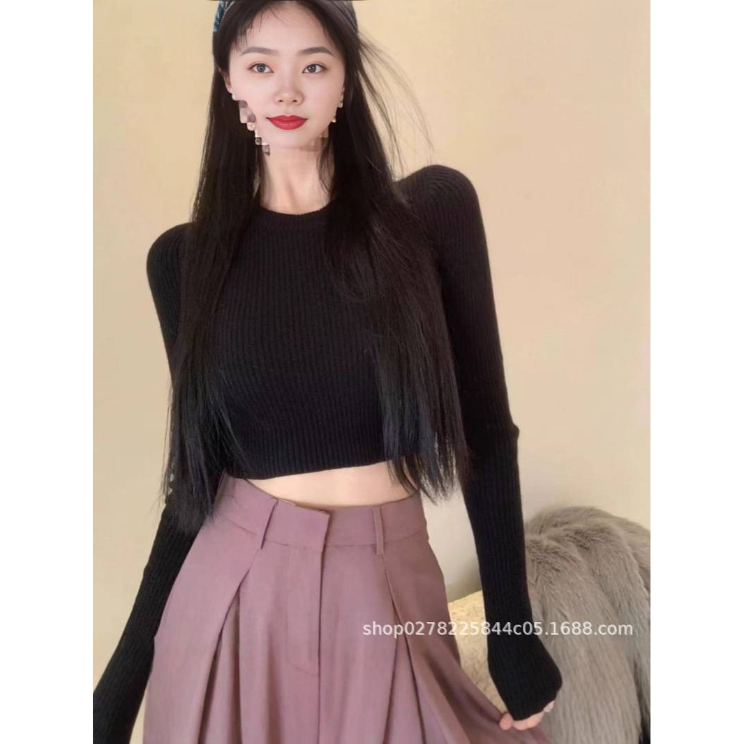 小个子露脐针织高腰短款上衣女春紧身内搭套头打底衫正肩长袖毛衣