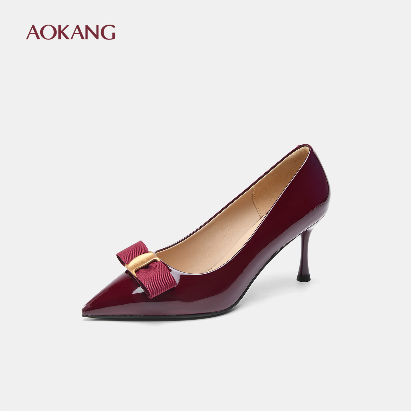 奥康 女鞋2025秋季新款尖头浅口蝴蝶结婚鞋细跟单鞋漆皮高跟鞋女