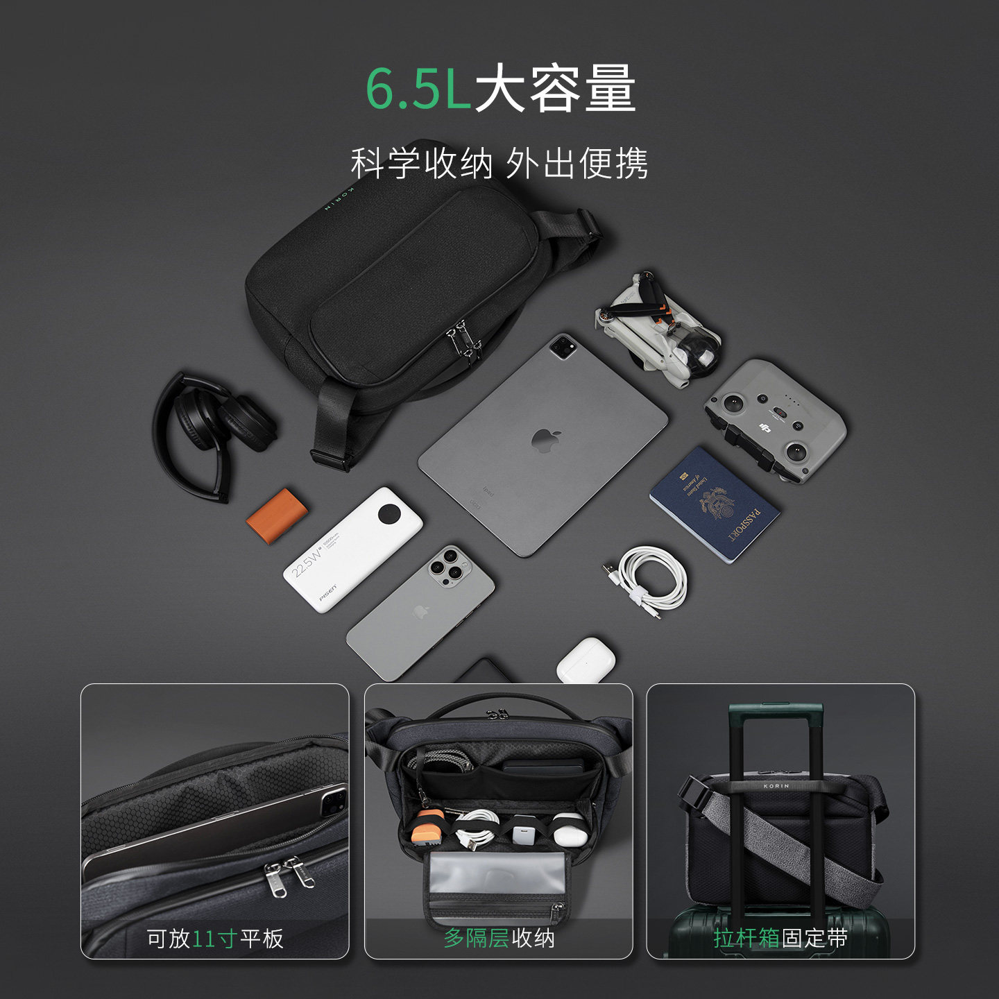 korin男士斜挎包大容量通勤外出便携胸包单肩挎包SnapSling Ultra
