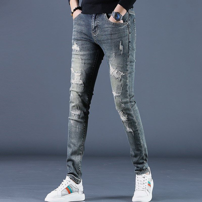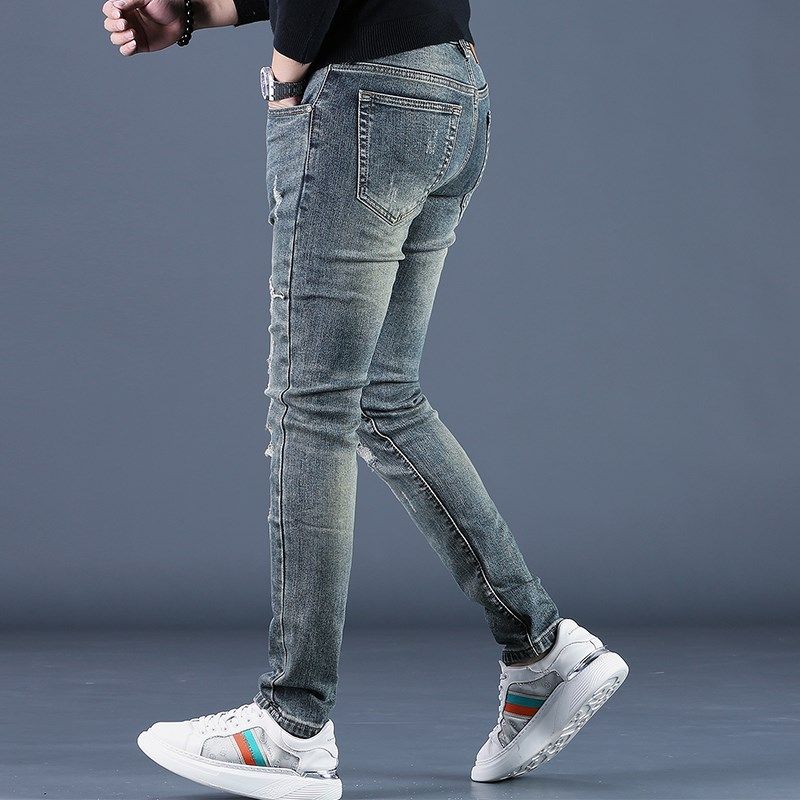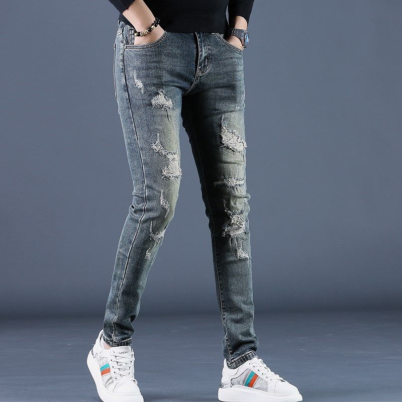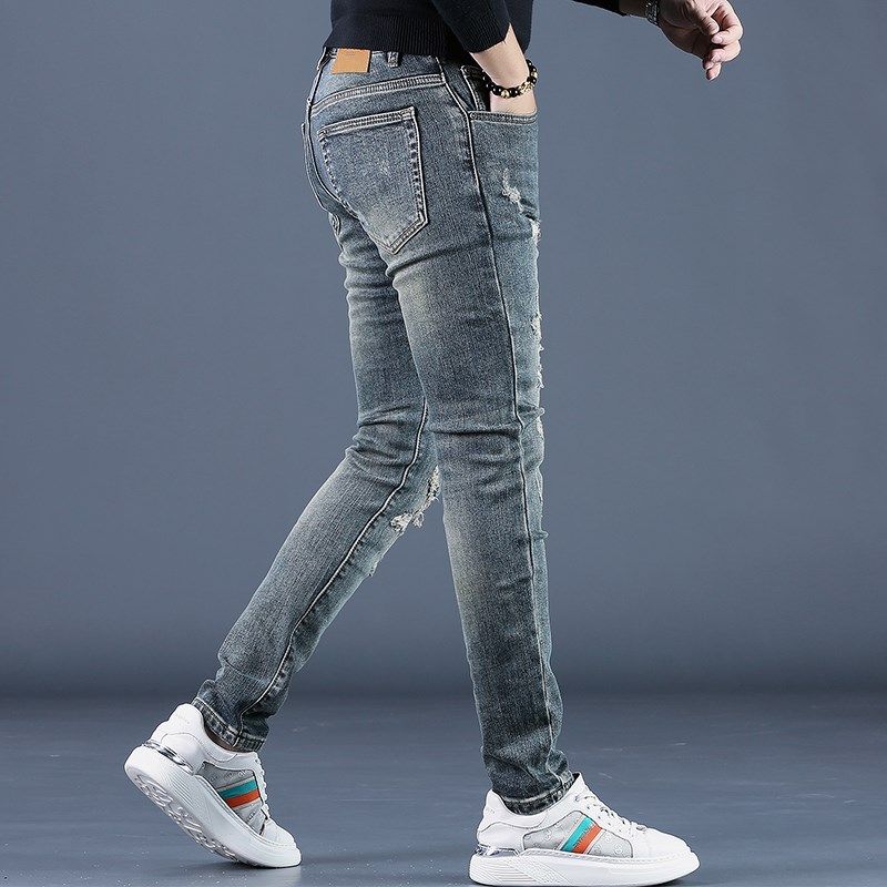 春季2025年高端新款复古破洞牛仔裤男士修身休闲潮牌蓝色小脚裤潮