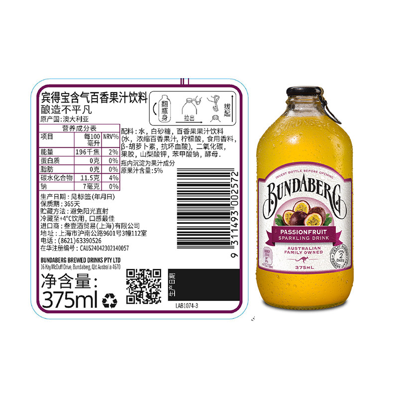 Bundaberg宾得宝澳洲进口百香果口味汽水375ml*4果汁气泡水饮料