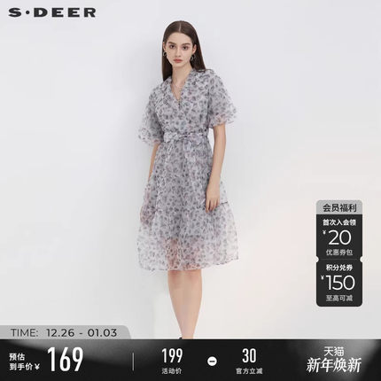 sdeer圣迪奥碎花连衣裙夏季女长裙V领收腰泡泡袖茶歇裙S223Z120E