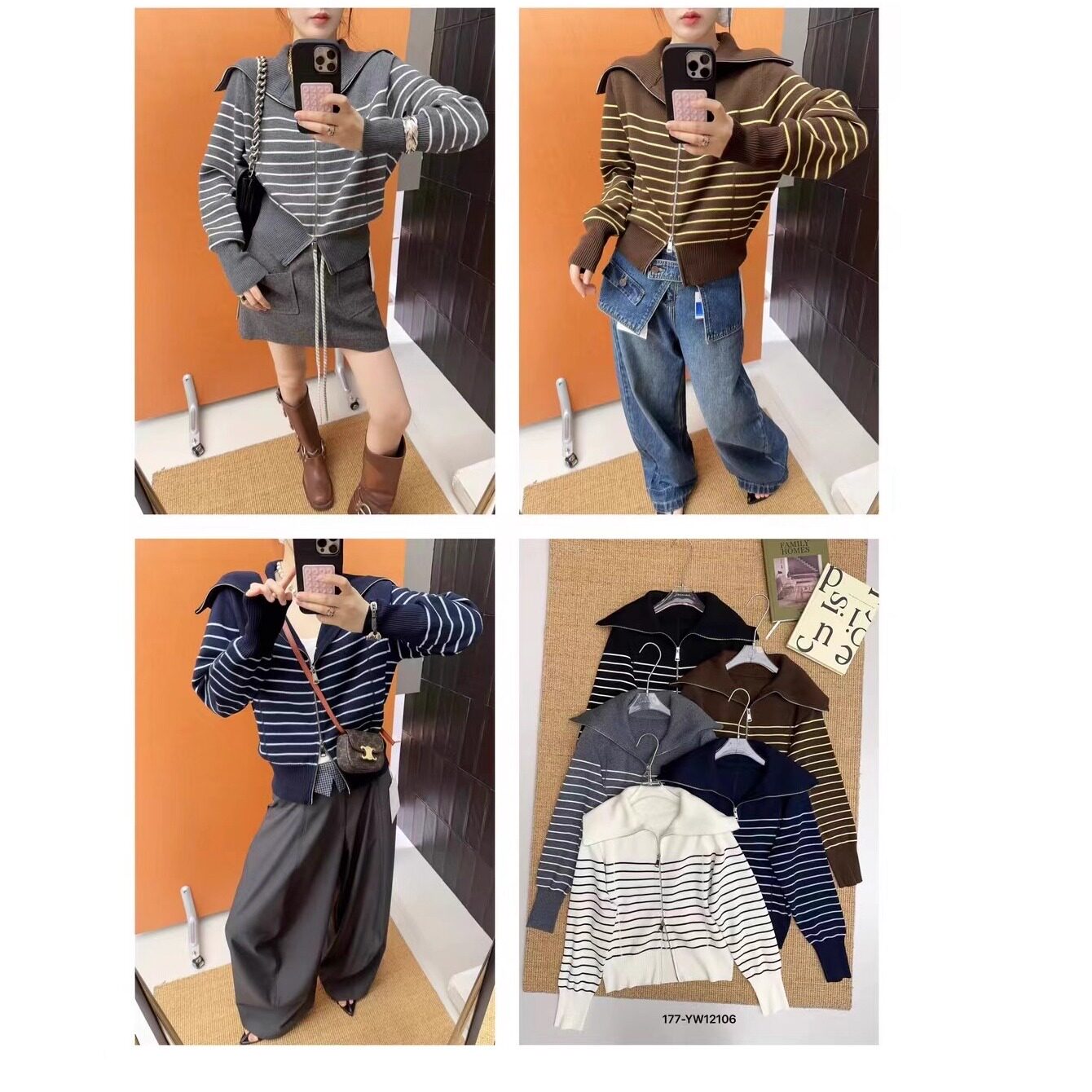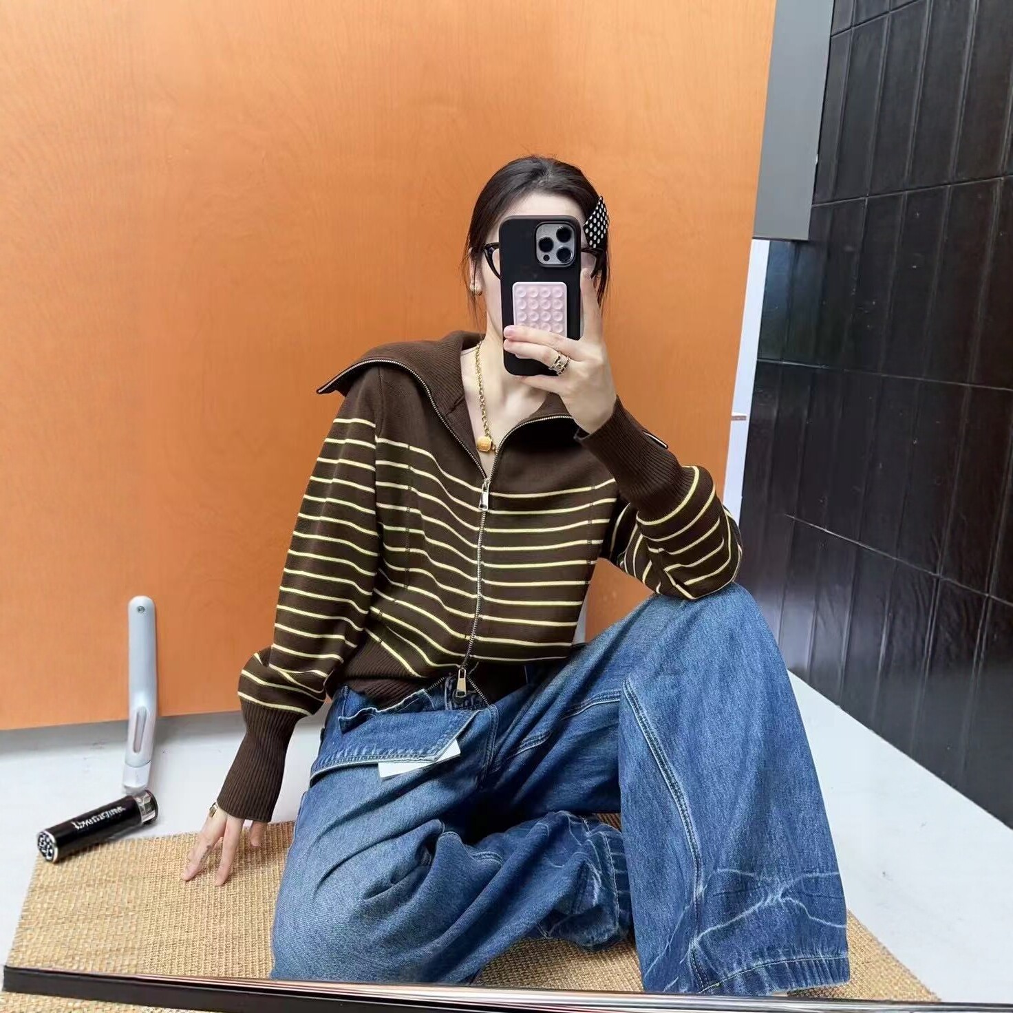 东大门秋冬翻领拼色条纹双拉链绵羊毛针织开衫女宽松百搭毛衣外套