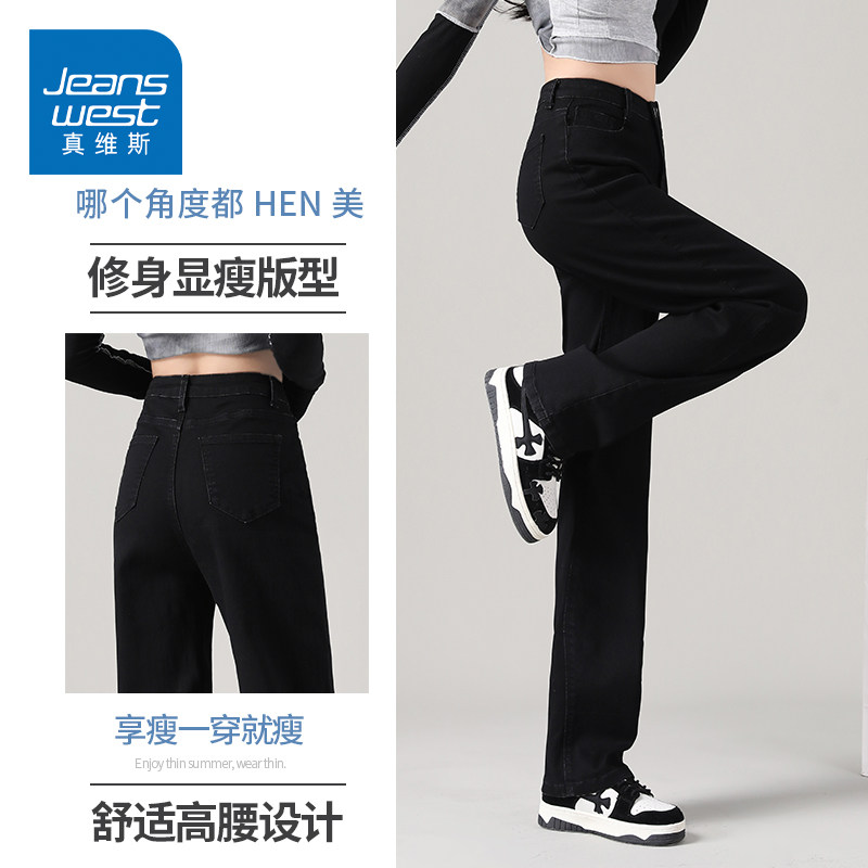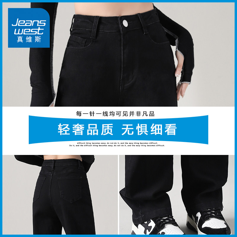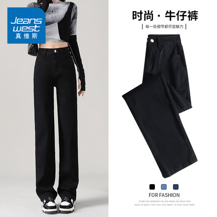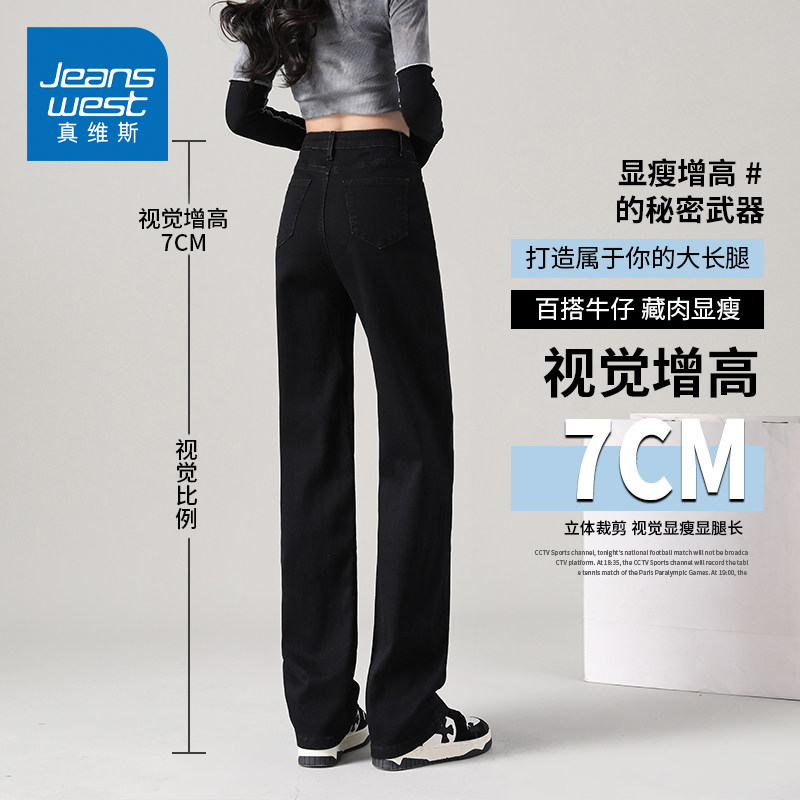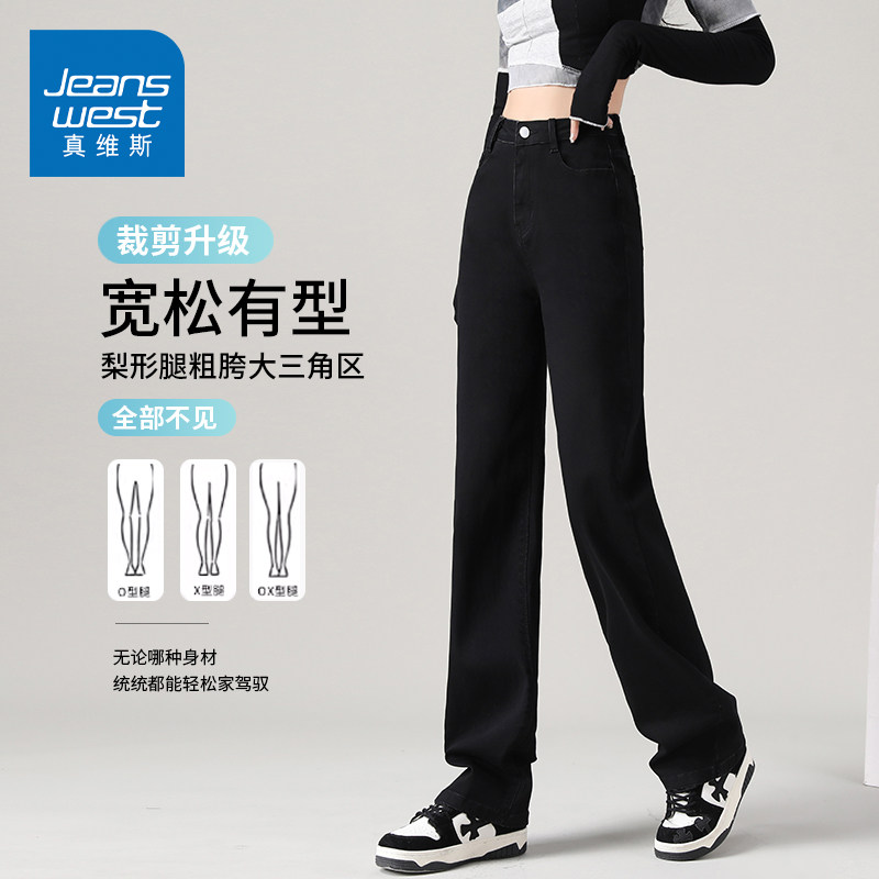 KZH真维斯高腰牛仔裤女秋冬新款宽松直筒裤黑色高腰阔腿长裤初秋