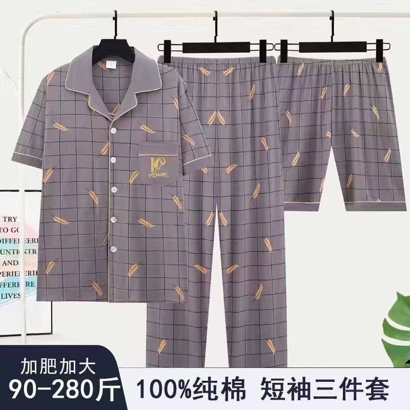 短袖大码三件套夏季长裤套装睡衣家居服休闲男士薄款纯棉