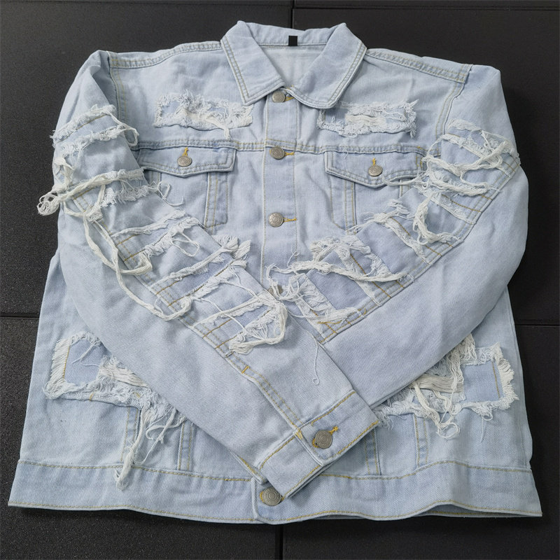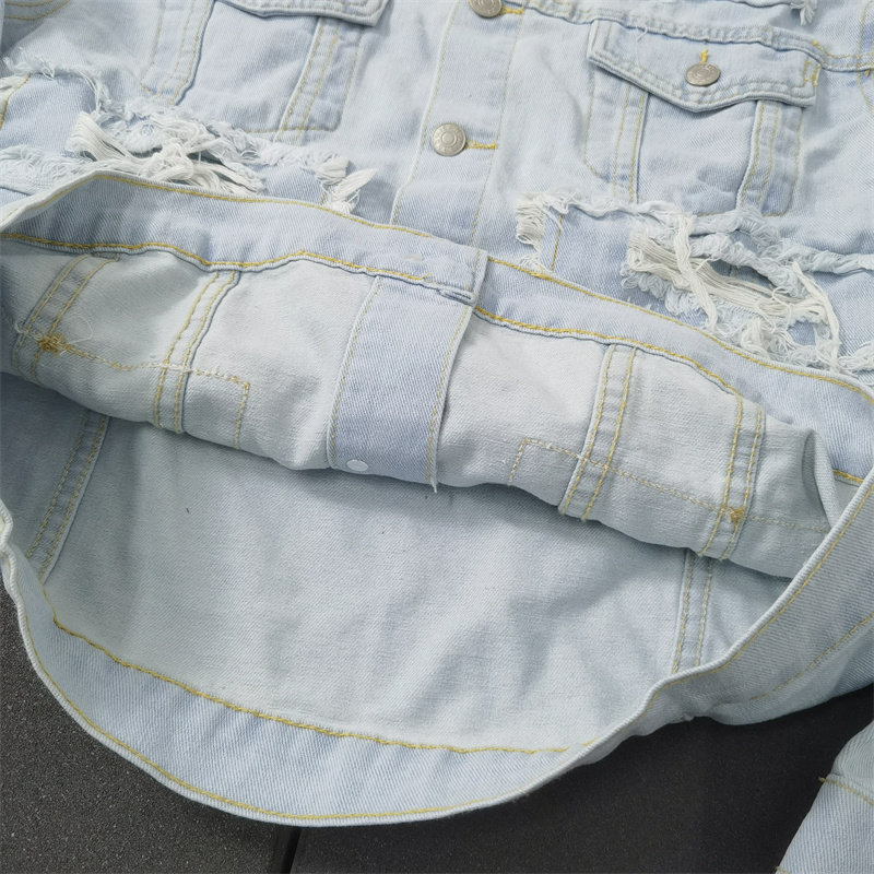 短装街头新潮重工拉丝破坏水洗浅蓝牛仔翻领夹克外套Y459包邮男