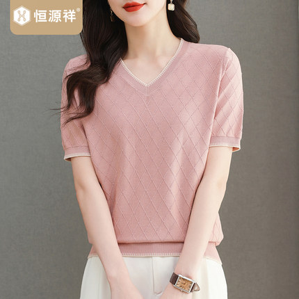 恒源祥薄款冰丝针织衫女士夏季新款V领提花短袖T恤气质宽松上衣