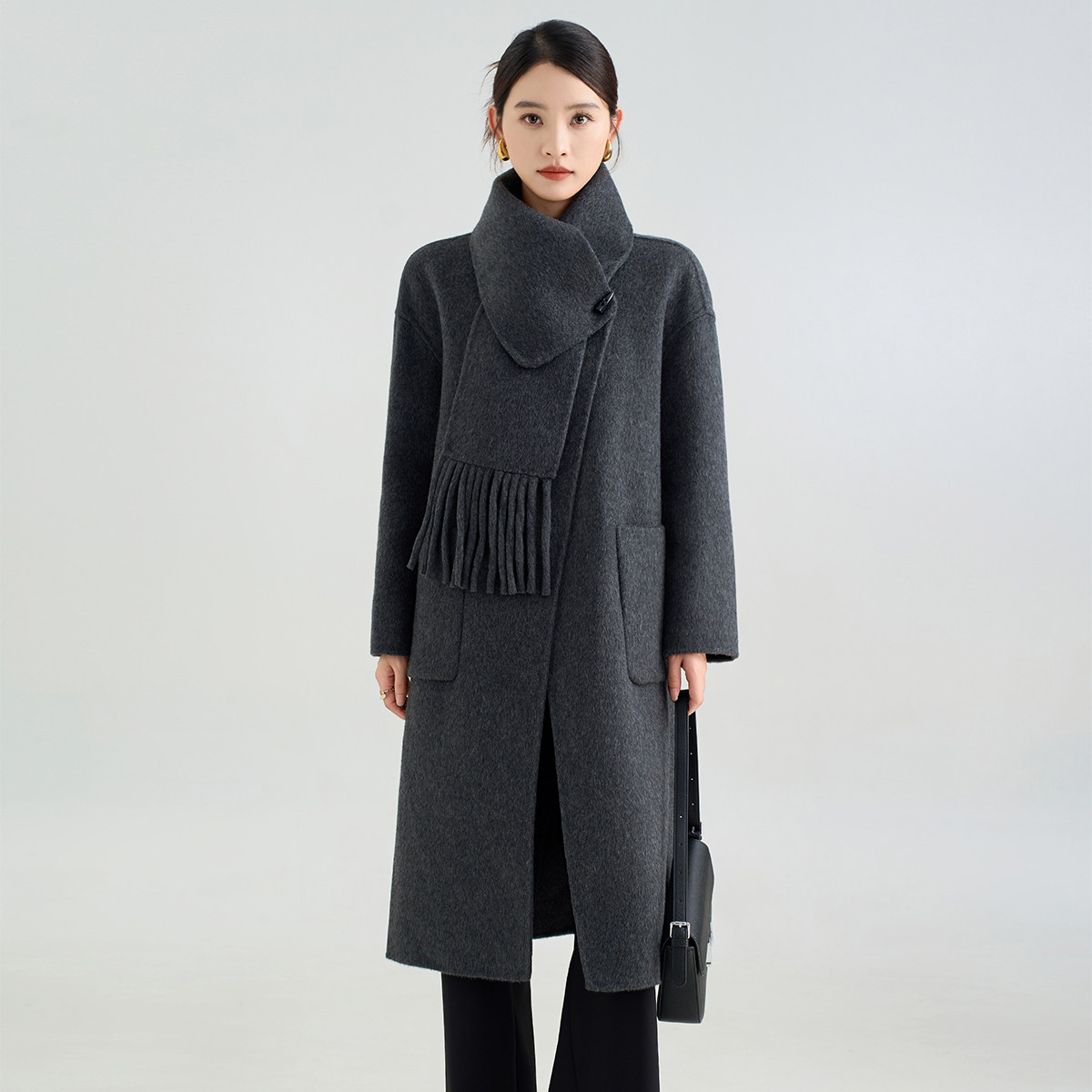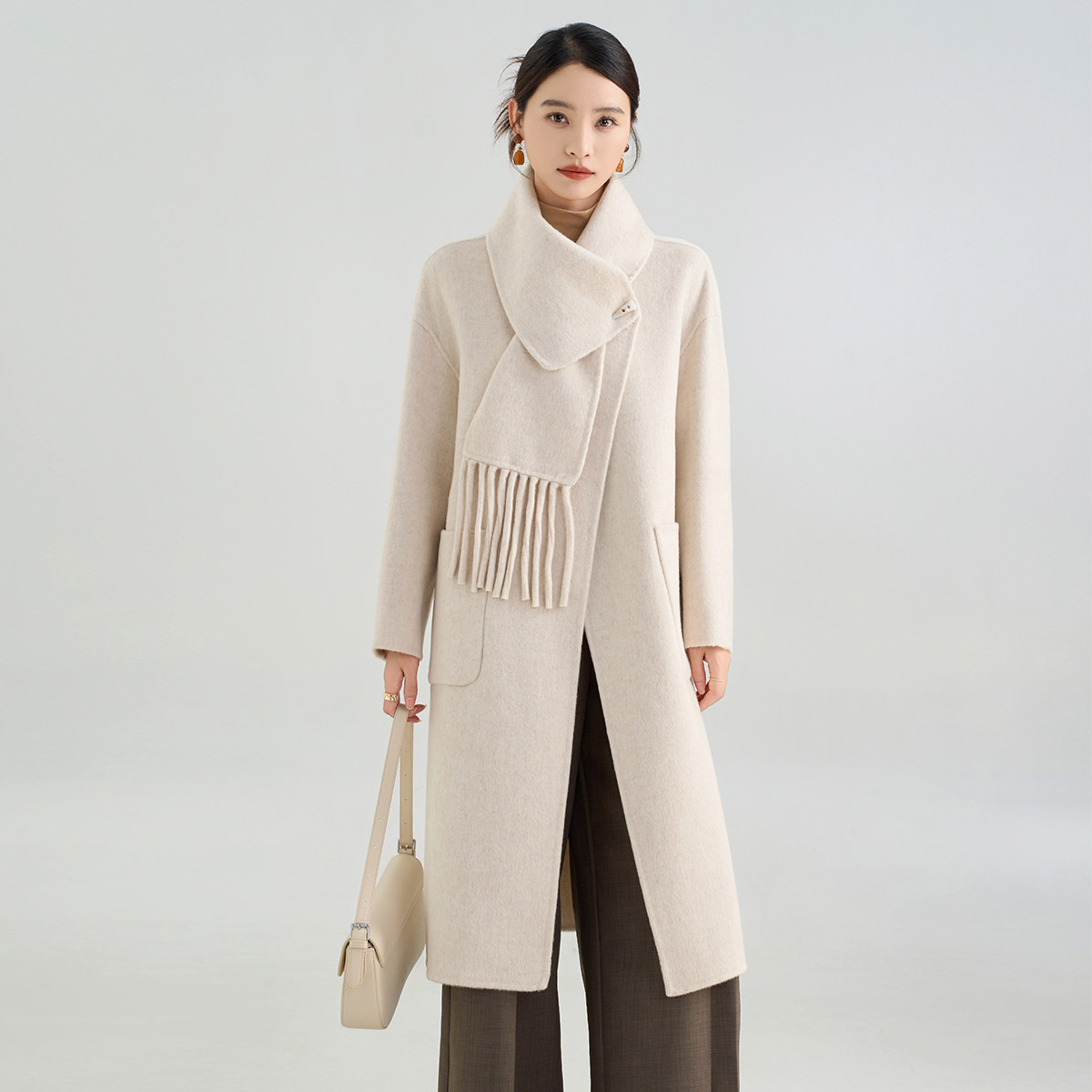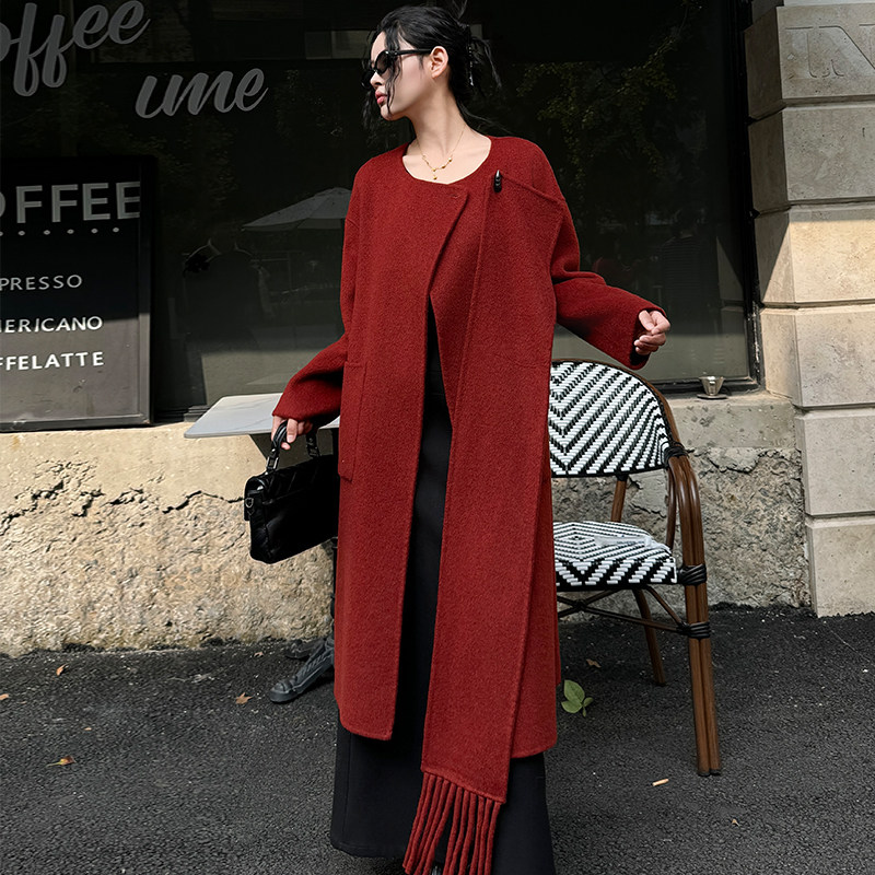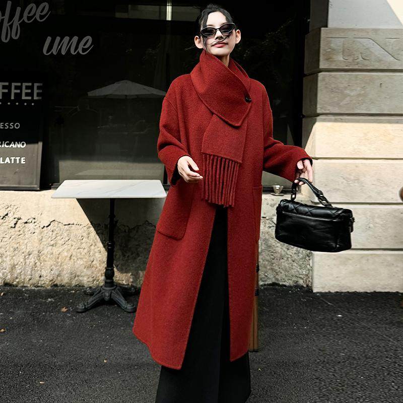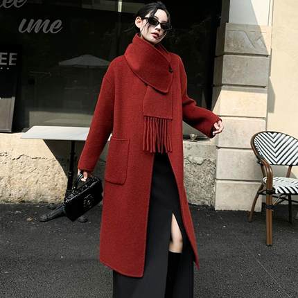双面羊绒大衣女红色中长款2025秋冬新款高级感围巾可拆卸毛呢外套