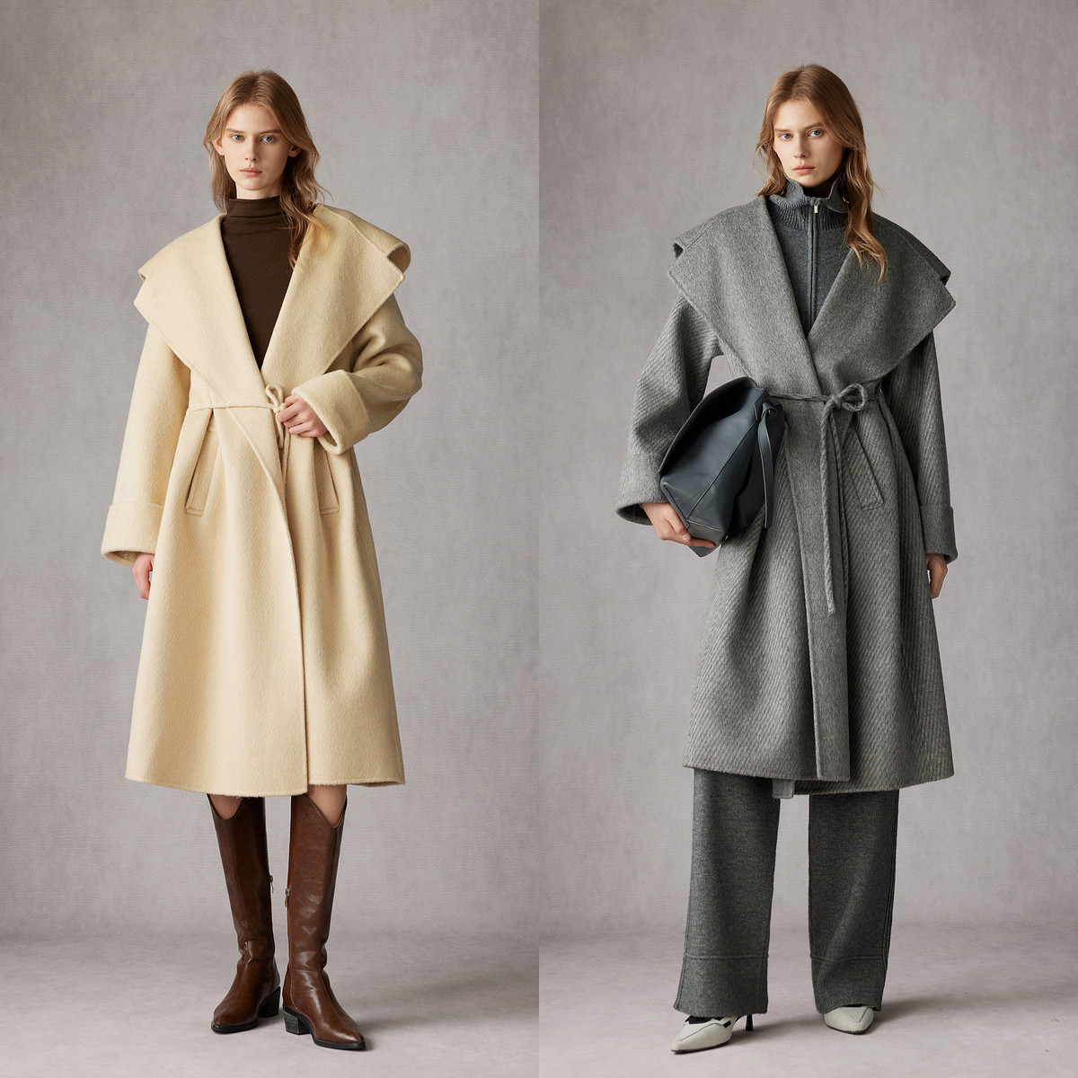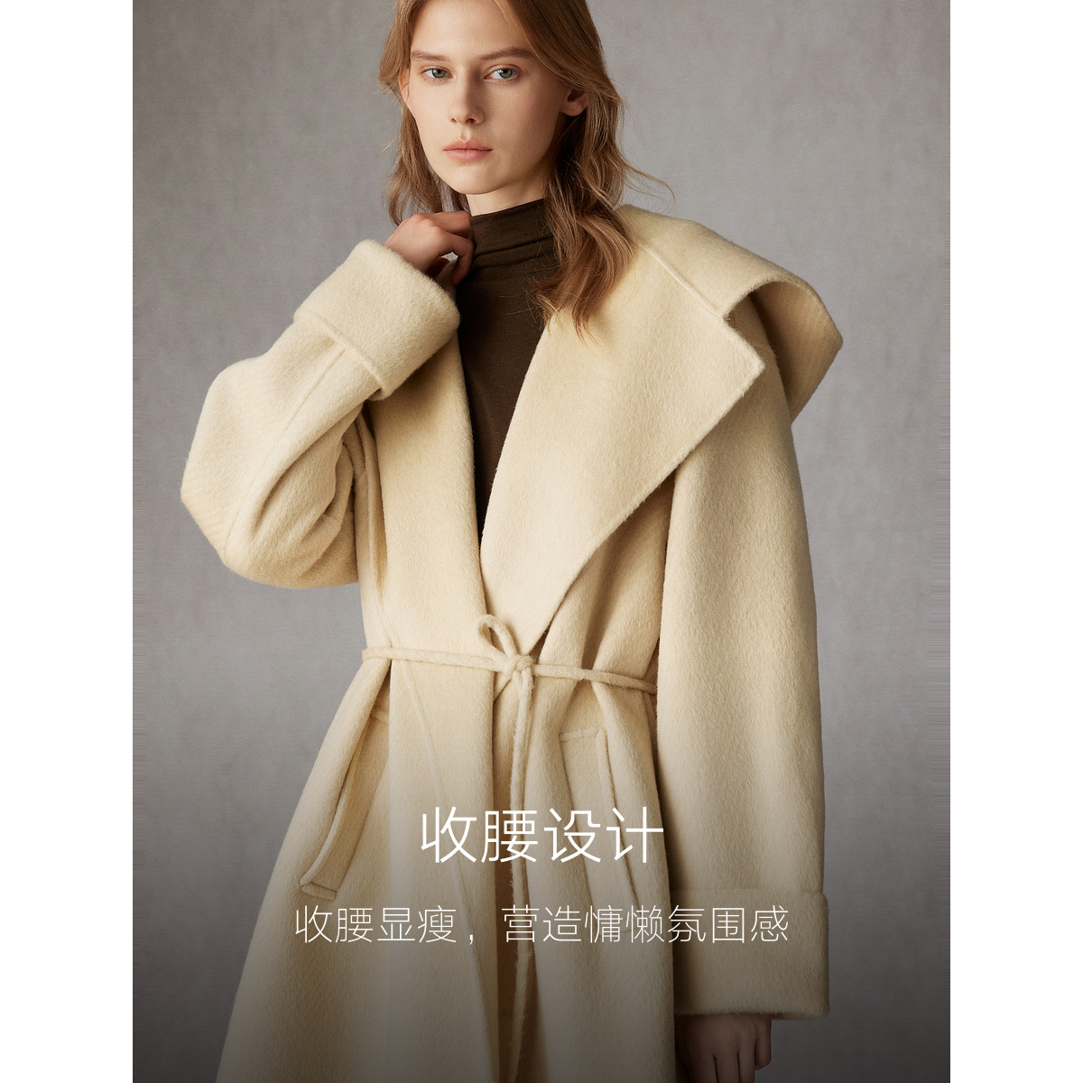 ELLE绵羊毛骆驼绒双面呢大衣女2025冬季新款中长款连帽毛呢外套