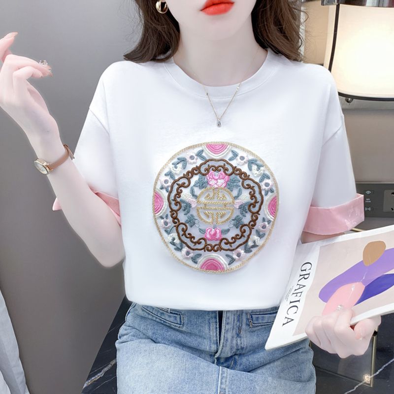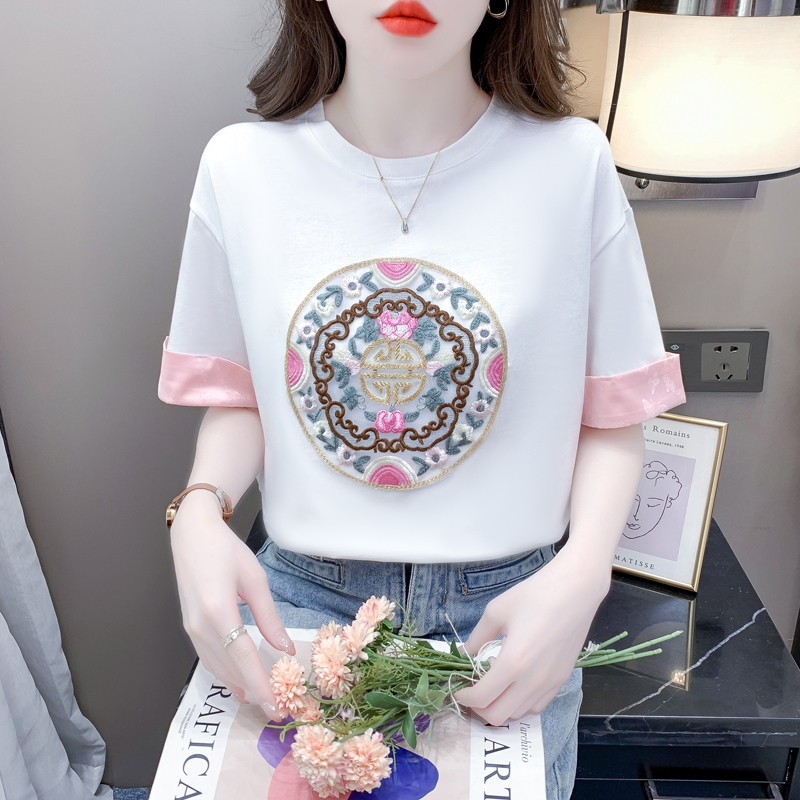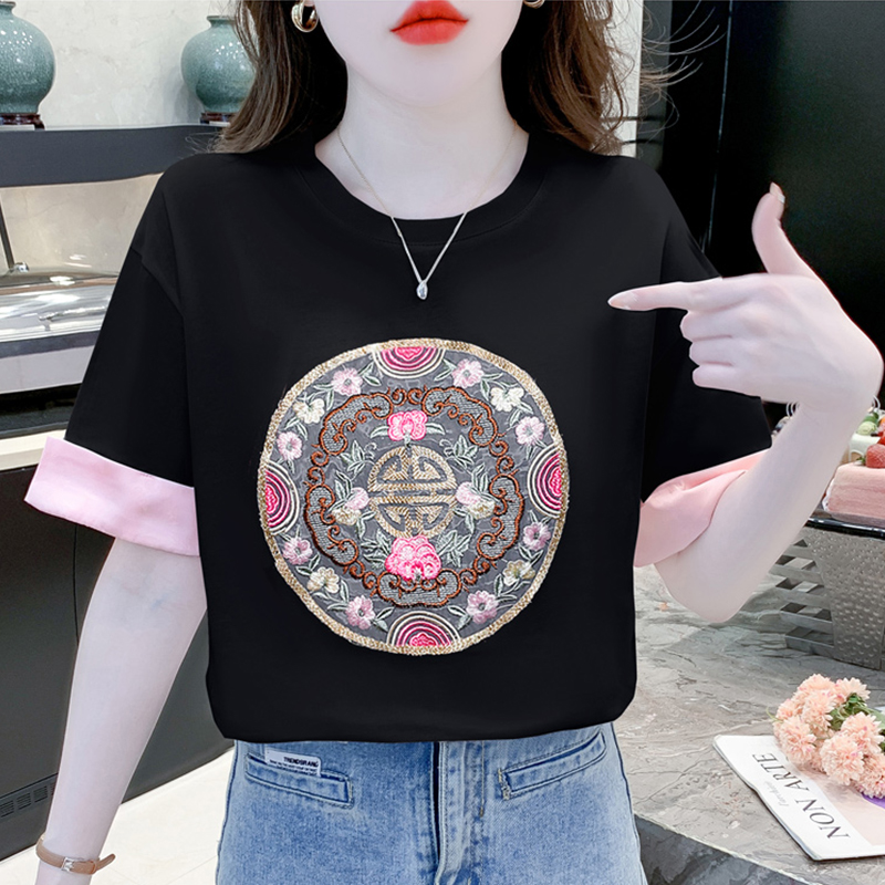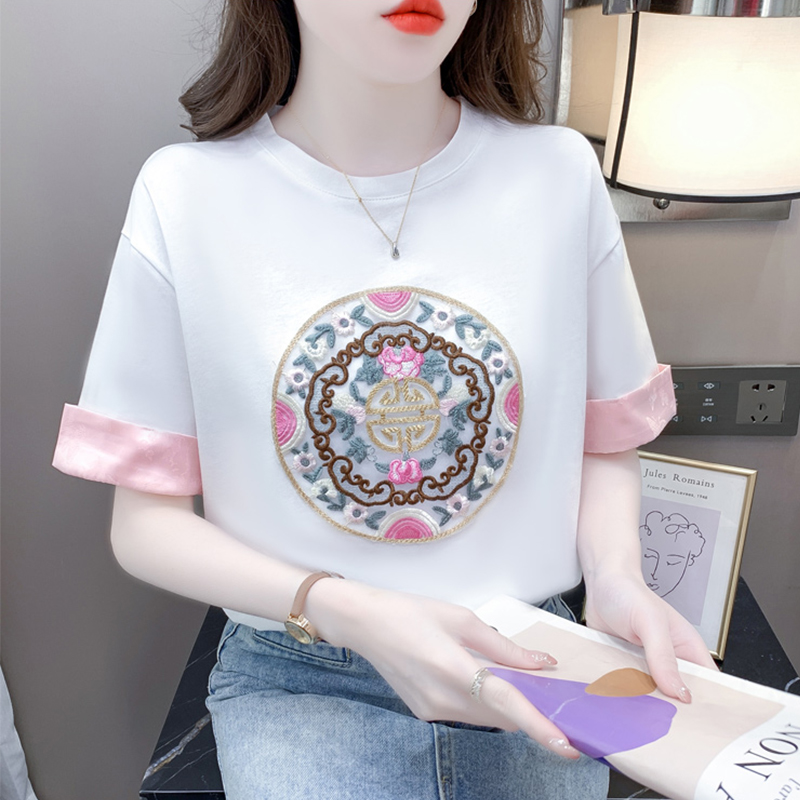 中式国风刺绣短袖t恤女新款夏季宽松纯棉半袖体恤圆领拼接上衣ins