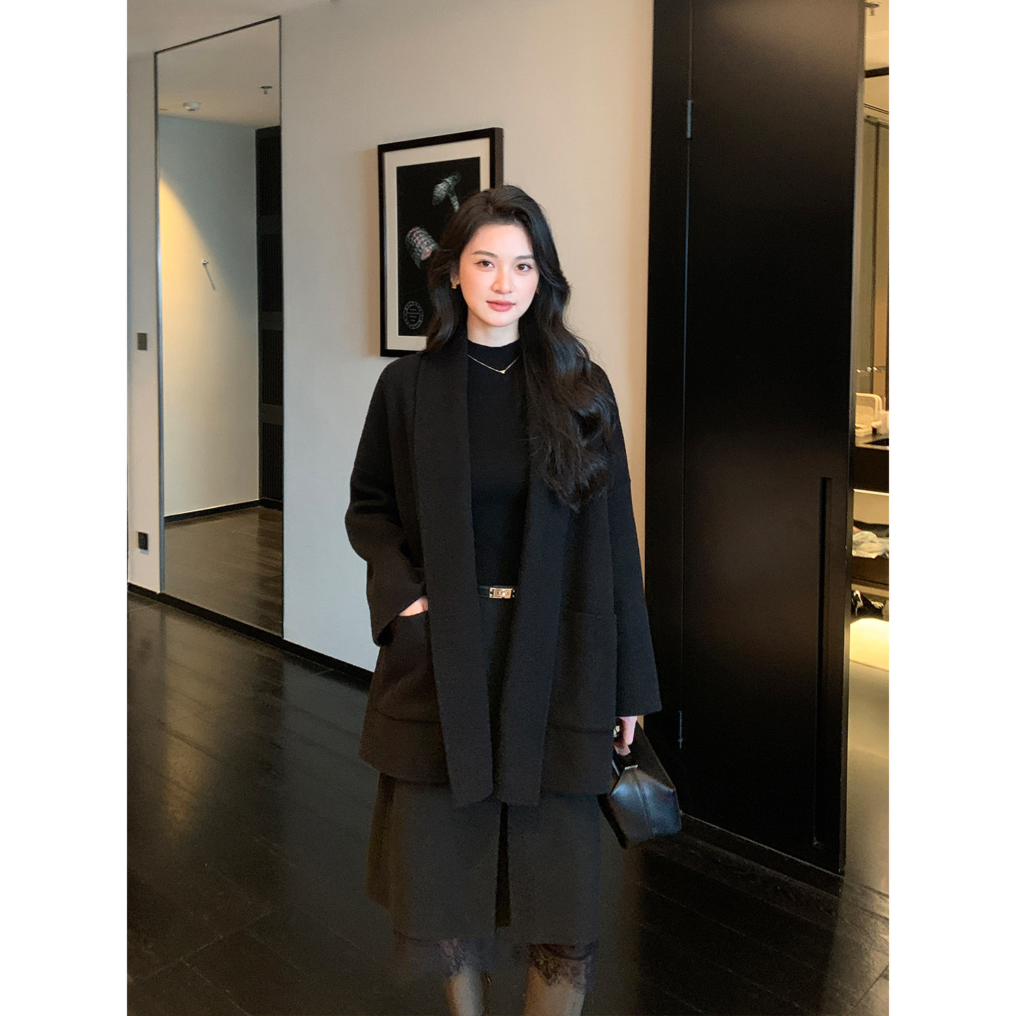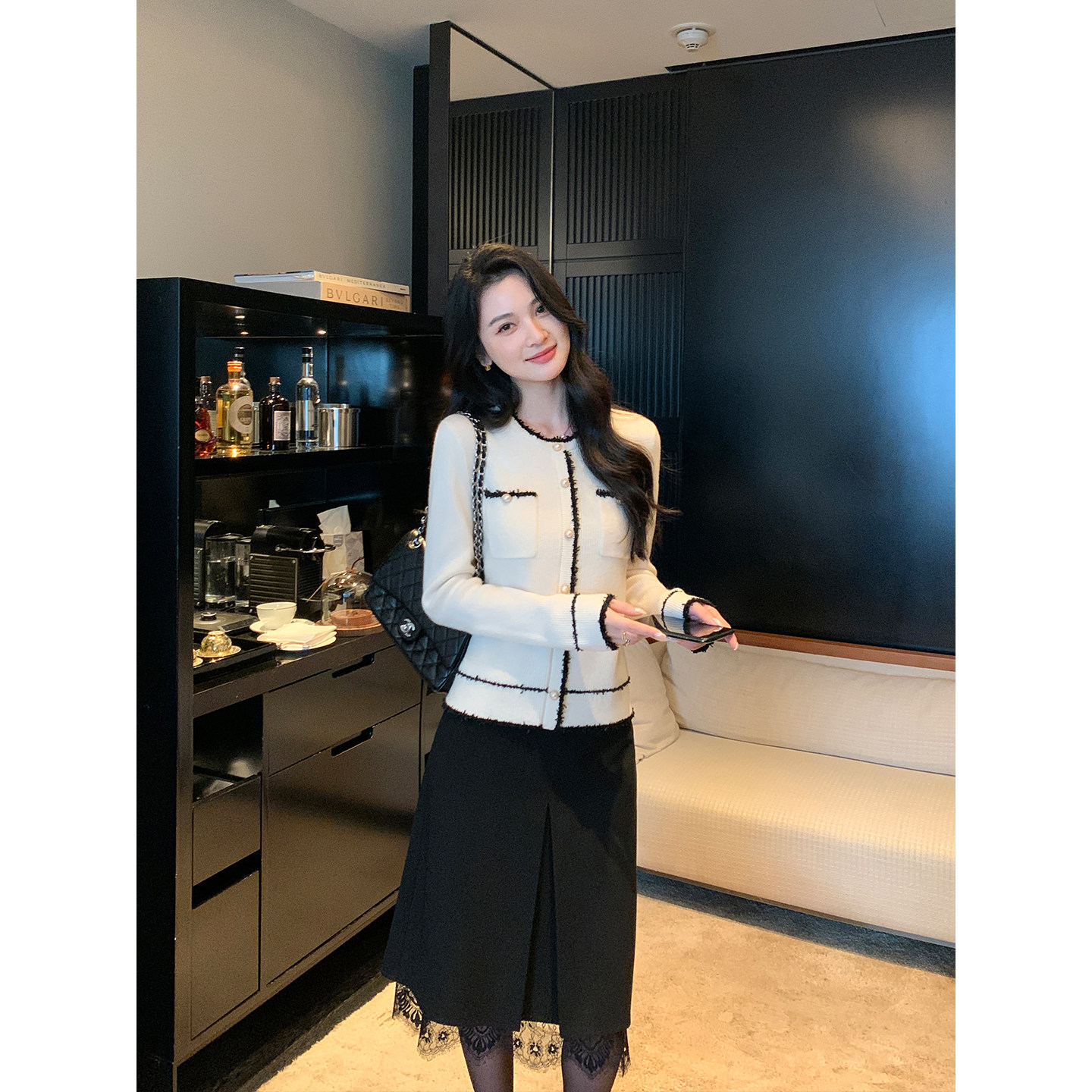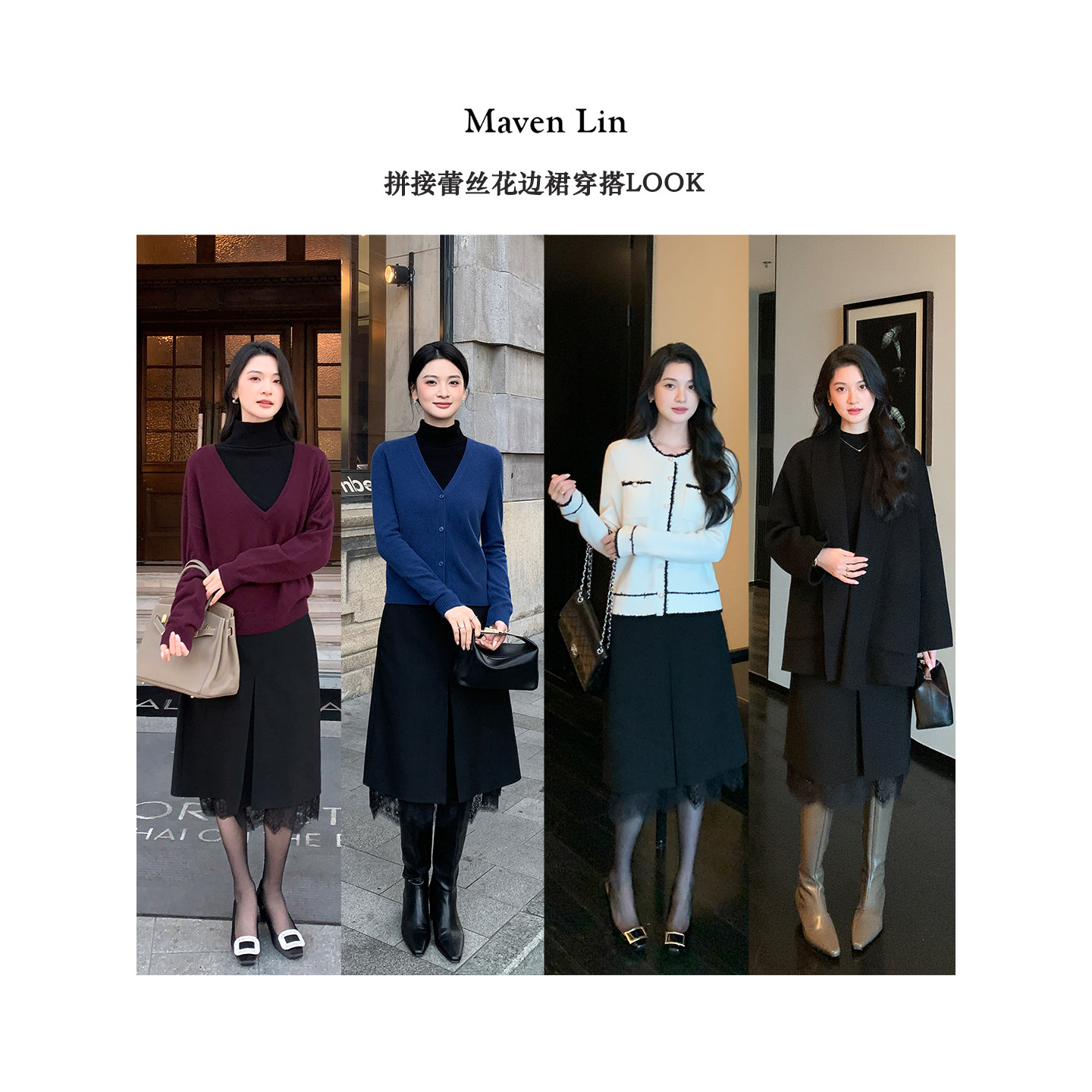 Maven Lin 智性职场 黑色蕾丝拼接半身裙女气质倒V开叉直筒中裙