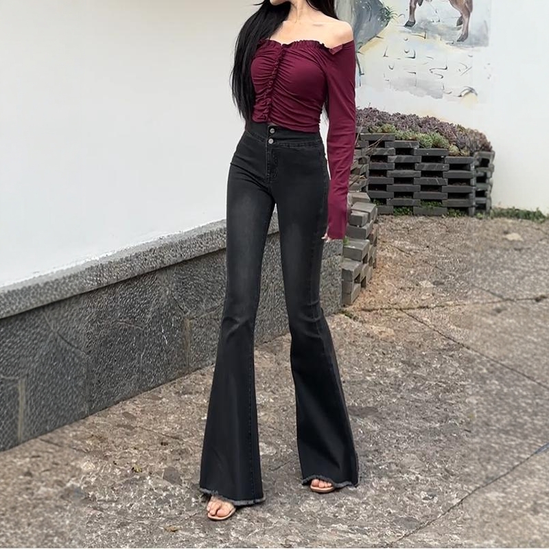李李服饰高腰毛边牛仔裤女2025年秋季新款修身显弹力鱼尾喇叭长裤