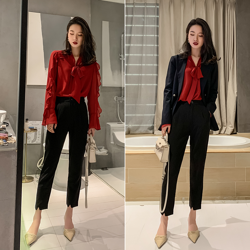 2025雪纺女上衣长袖气质打底衫超仙洋气v领喇叭袖荷叶边飘带衬衫