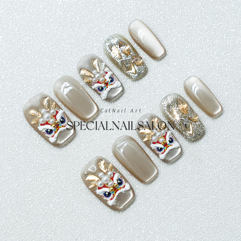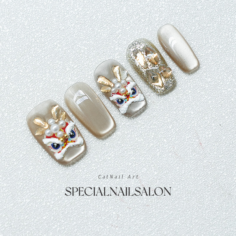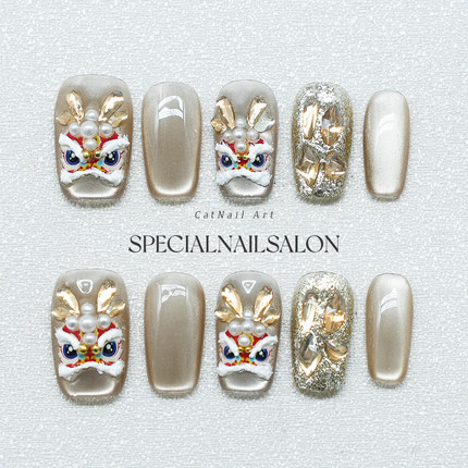 【东方龙狮】纯手工穿戴甲3D立体浮雕高级感轻奢新年款醒狮美甲片