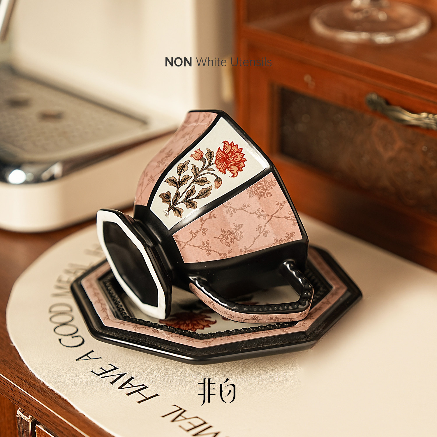 中古风咖啡杯设计师款法式复古牡丹八角陶瓷杯碟精致小众下午茶杯