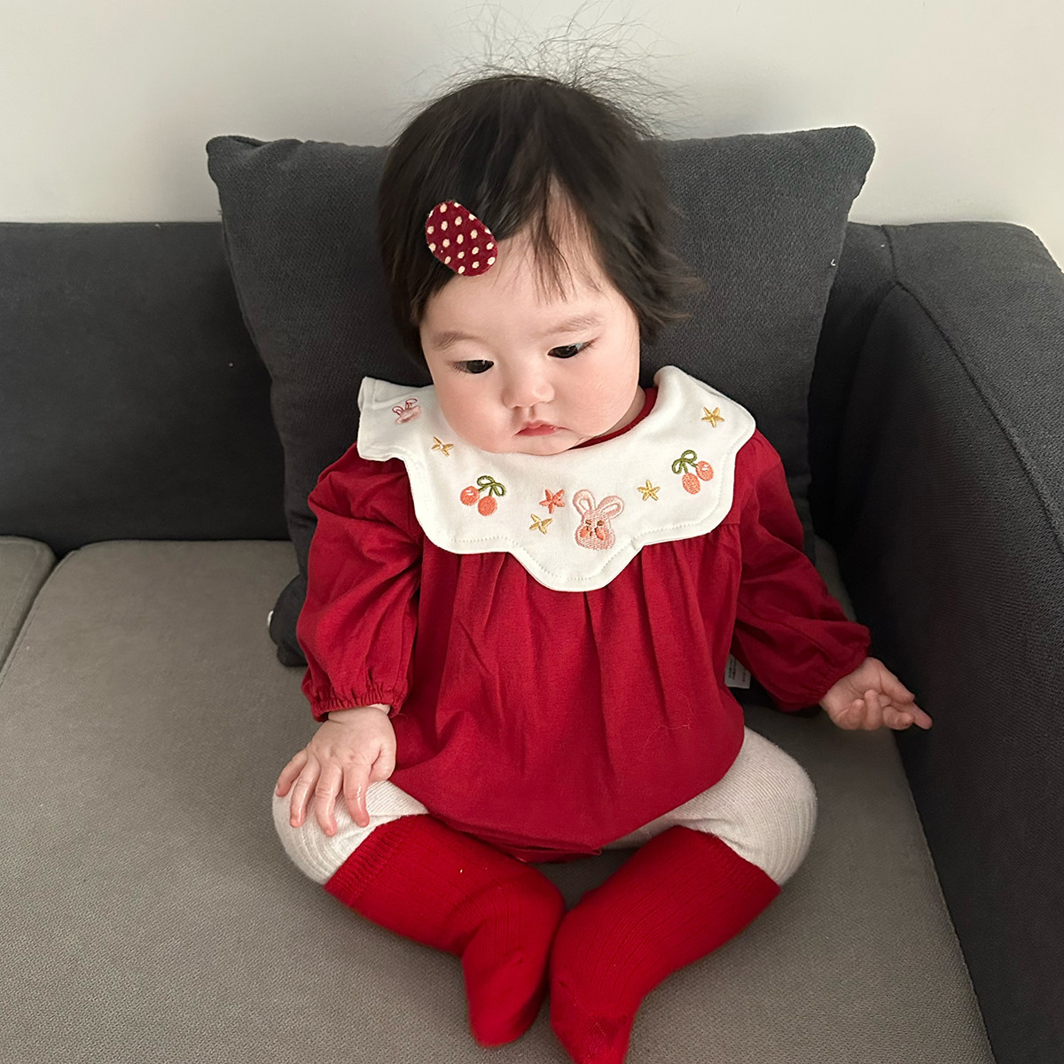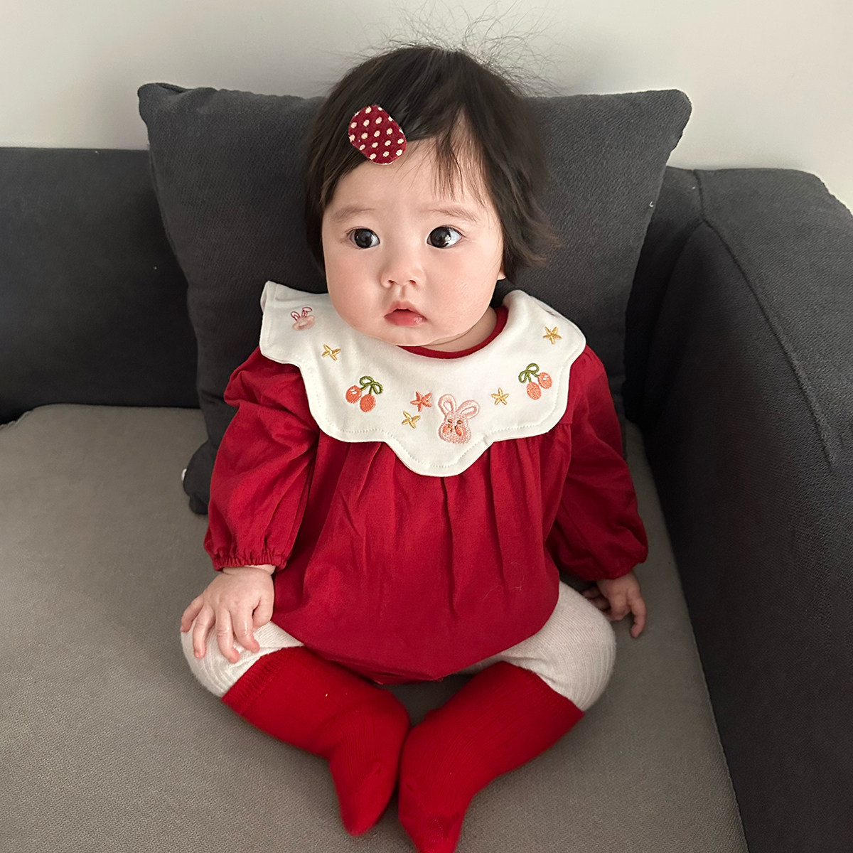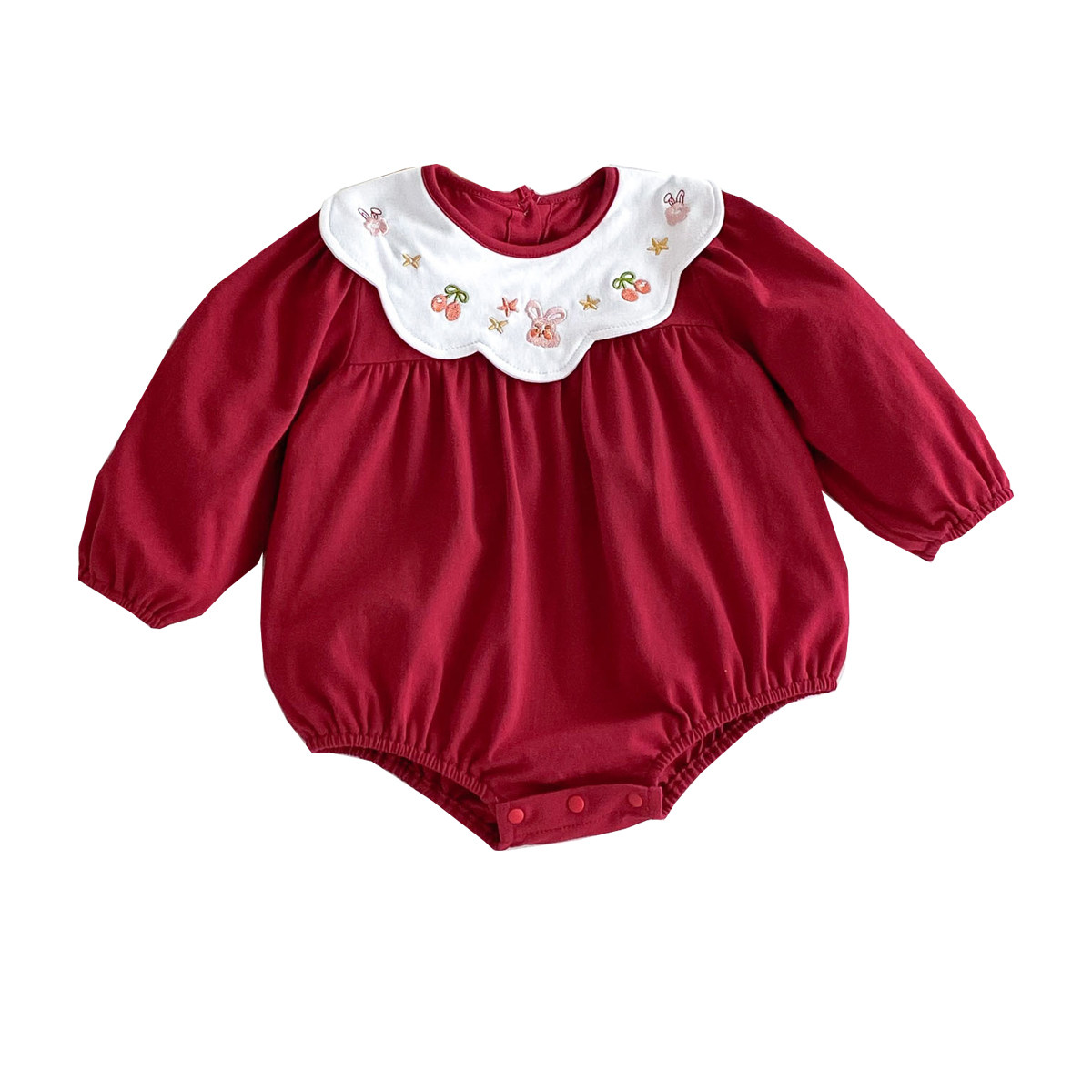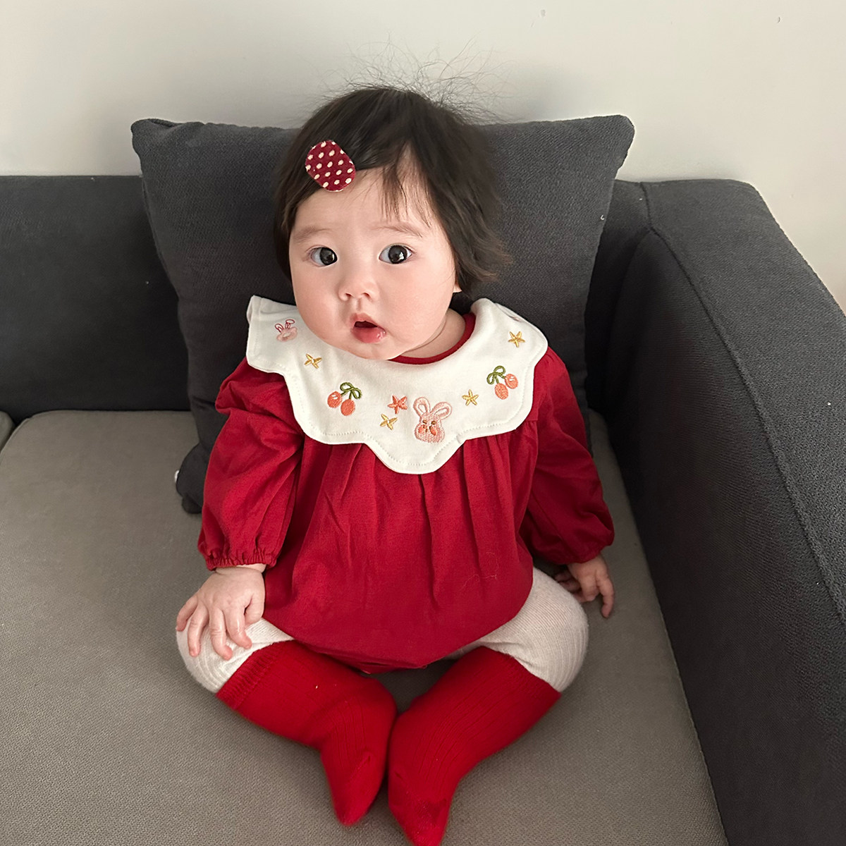 婴儿红色衣服春秋装女宝宝满月百天周岁礼服长袖连体衣棉质哈衣薄
