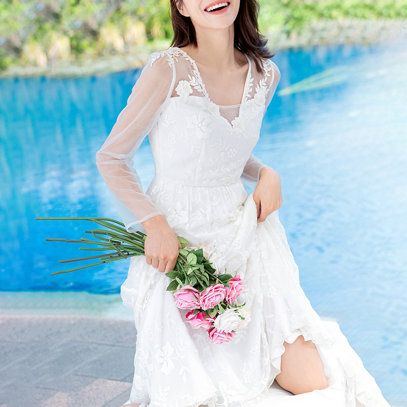美妃连衣裙春夏新款小香风气质女神范真丝绣花中长款过膝女装白色