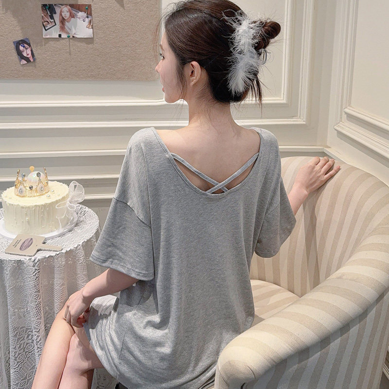 莫代尔睡衣女夏季短袖性感纯欲风露背带胸垫纯棉宽松可外穿家居服