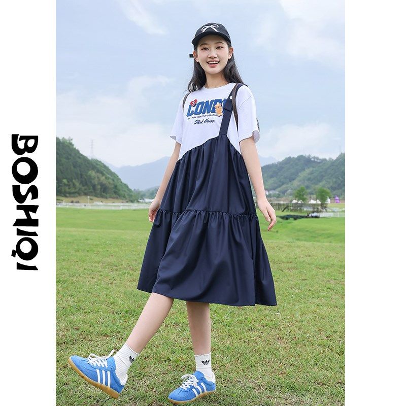 女大童假两件短袖背带连衣裙2025夏装新款学院风初中学生夏季裙子
