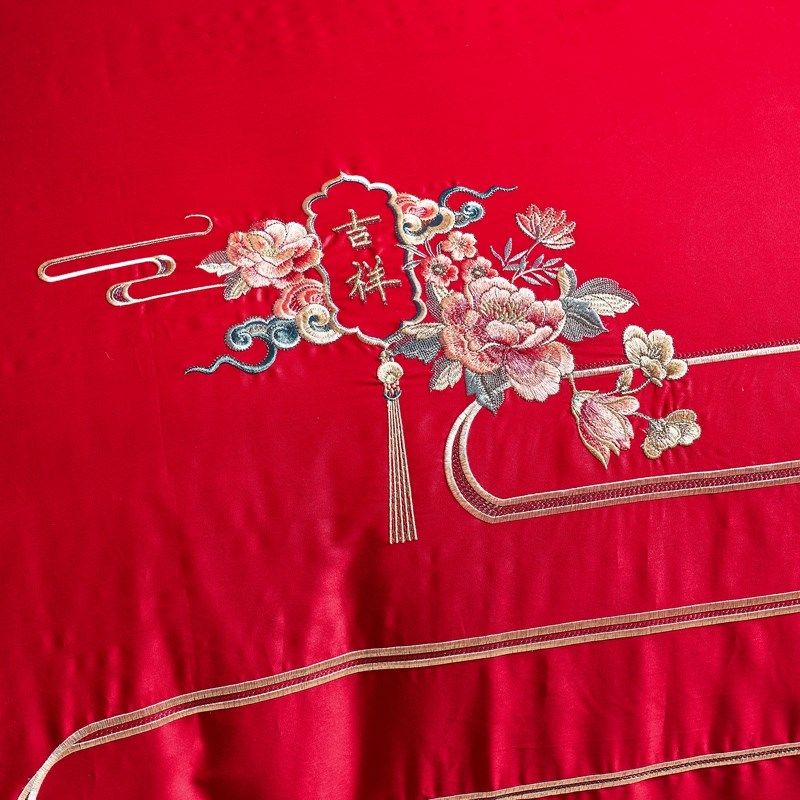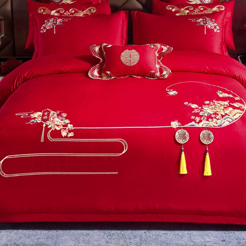 结婚四件套床g上用品新婚喜被红色床单婚嫁喜字简刺绣全棉中式婚