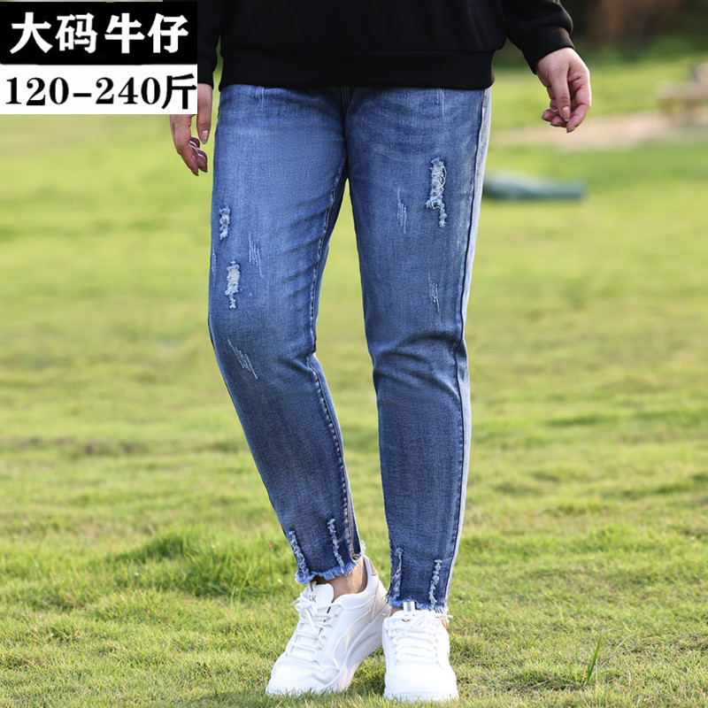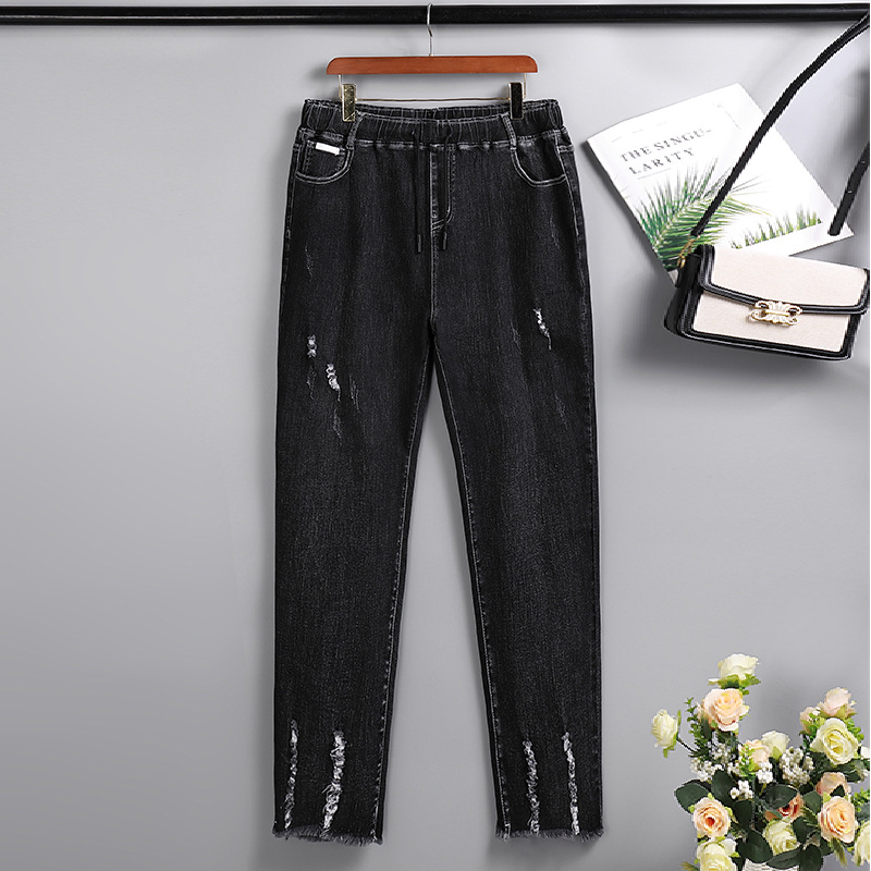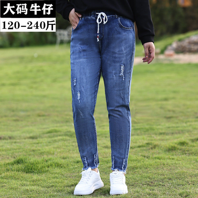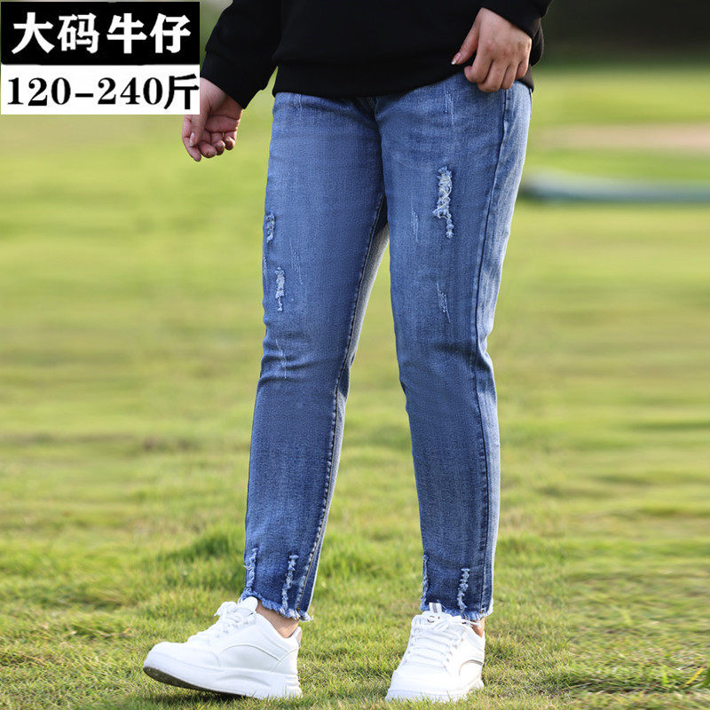 2025春秋加肥加大码胖mm松紧高腰显瘦破洞毛边小脚牛仔裤女 200斤