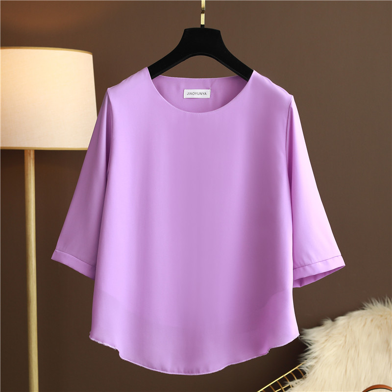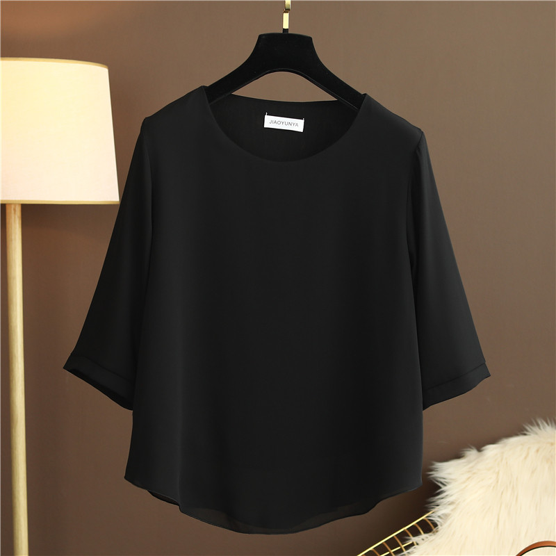 欧洲站夏季大码女装圆领纯色宽松遮肚子百搭小衫雪纺衫短袖上衣女