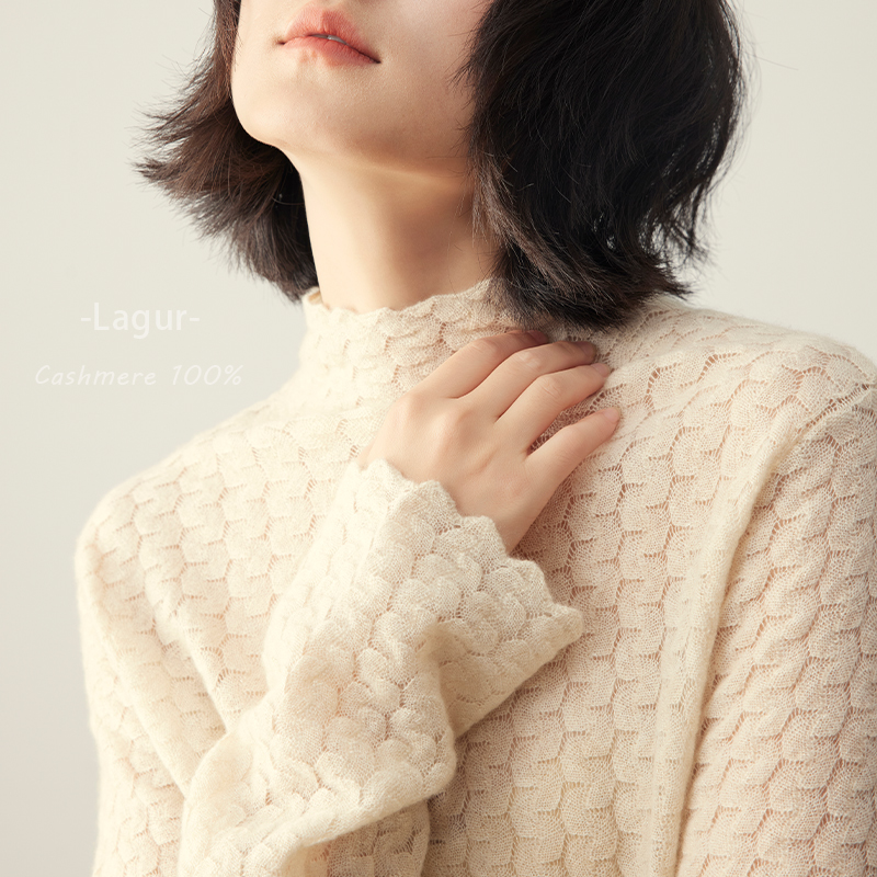 蕾丝100%Cashmere艺术纯山羊绒打底衫半高领宽松内搭上衣秋冬高级