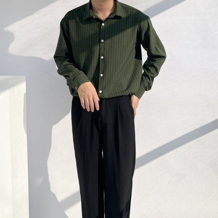 丝滑复古轻熟港风免烫抗皱宽松春秋男长袖条纹衬衫高级垂感墨绿色