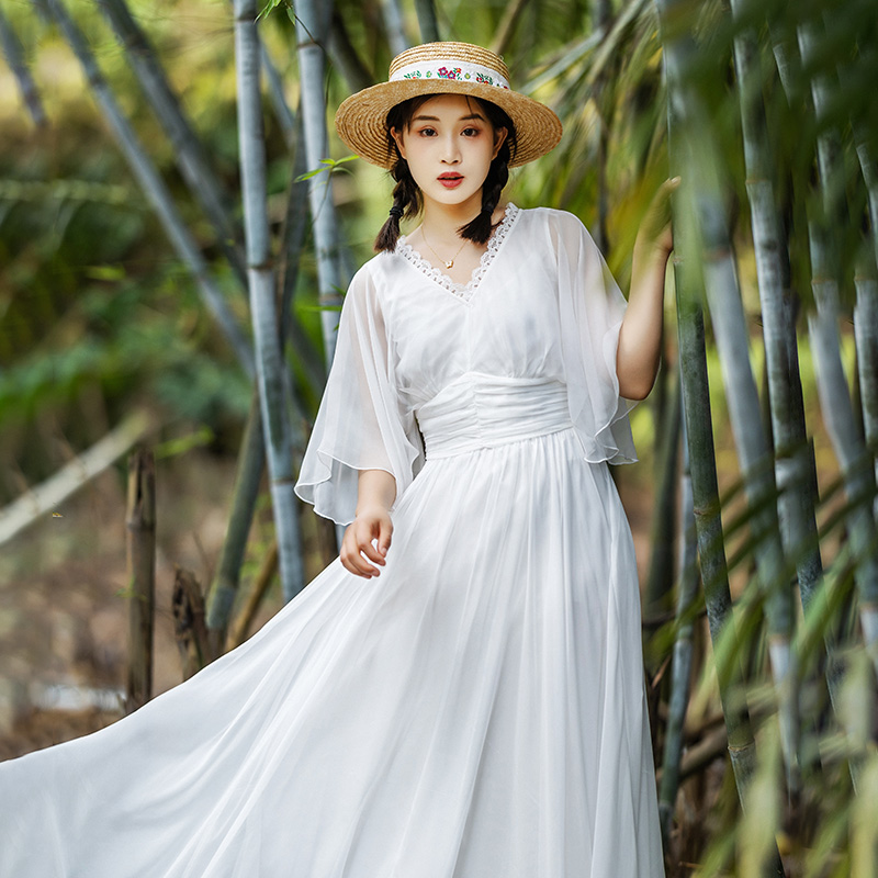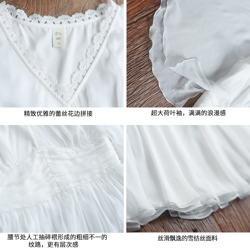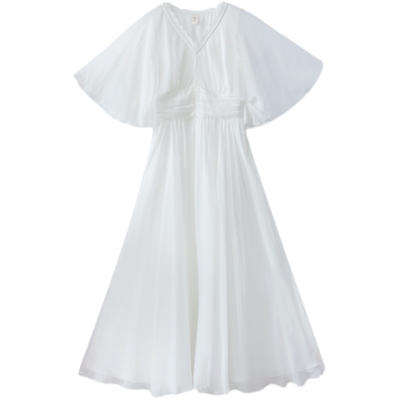 现货【白仙歌】白色连衣裙女高级感夏季新款V领雪纺长裙脚踝超仙