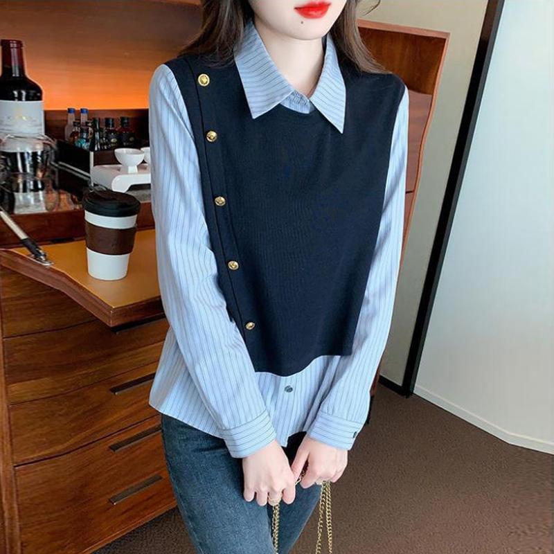 新款百搭长袖假两件拼接条纹衬衫