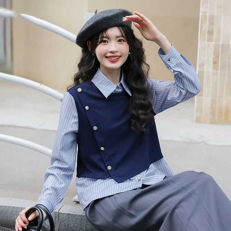 假两件拼接条纹衬衫女2025秋季新款宽松显瘦设计感百搭长袖上衣潮