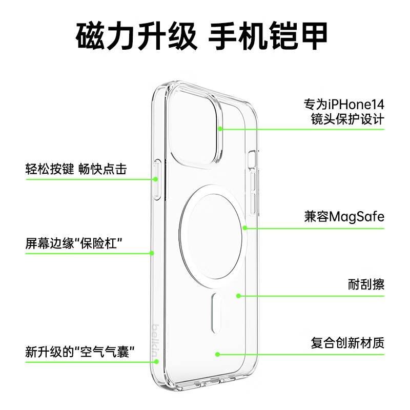 BELKIN贝尔金适用于苹果14手机壳透明磁吸MagSafe保护套超薄抗菌全包防摔防指纹iPhone14ProMax