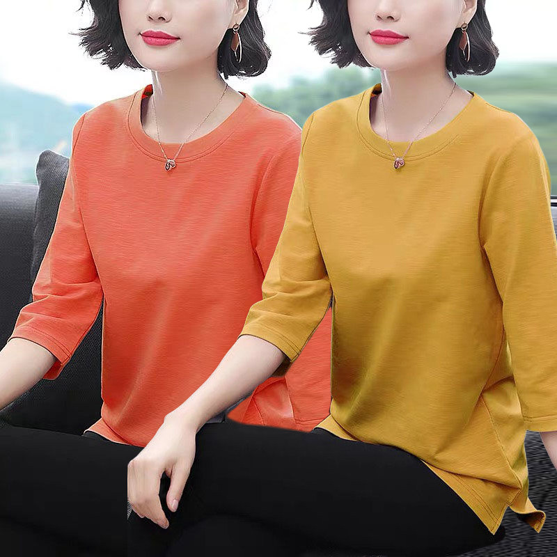 新款大码女装七分袖上衣长袖妈妈中长款纯色中袖t恤女宽松薄款夏T