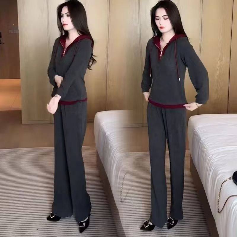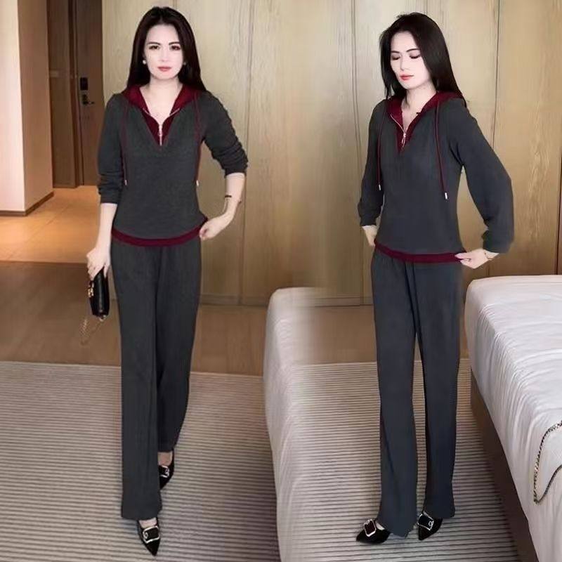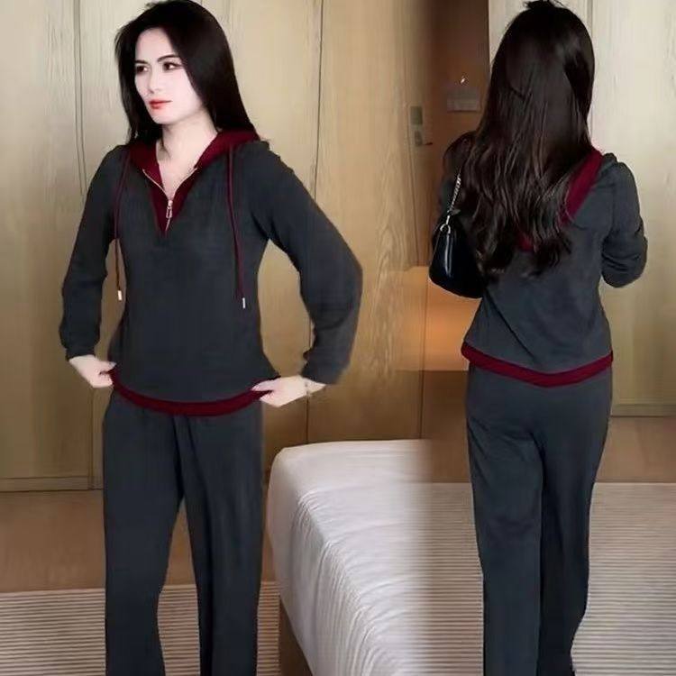 春秋新款时尚减龄连帽上衣裤子俩件套女秋季高档遮肚运动休闲套装