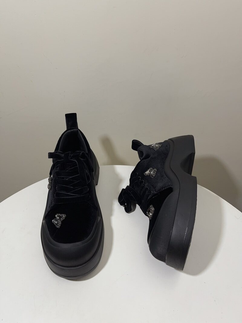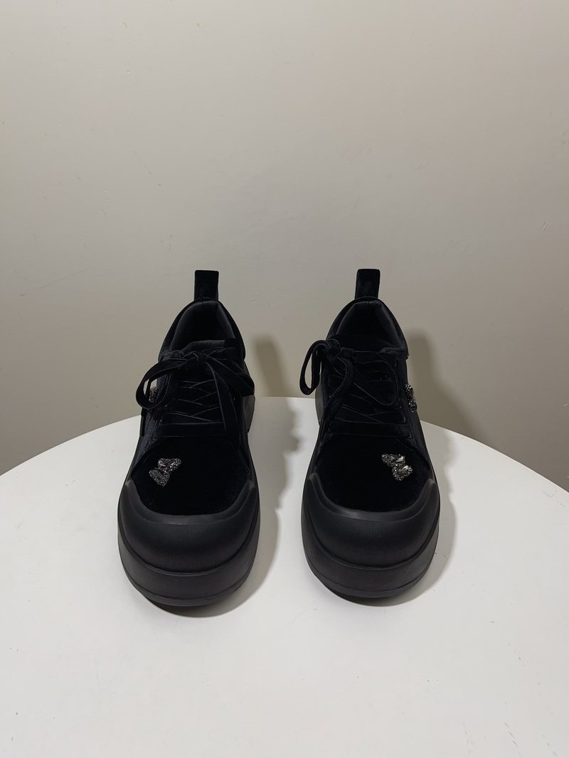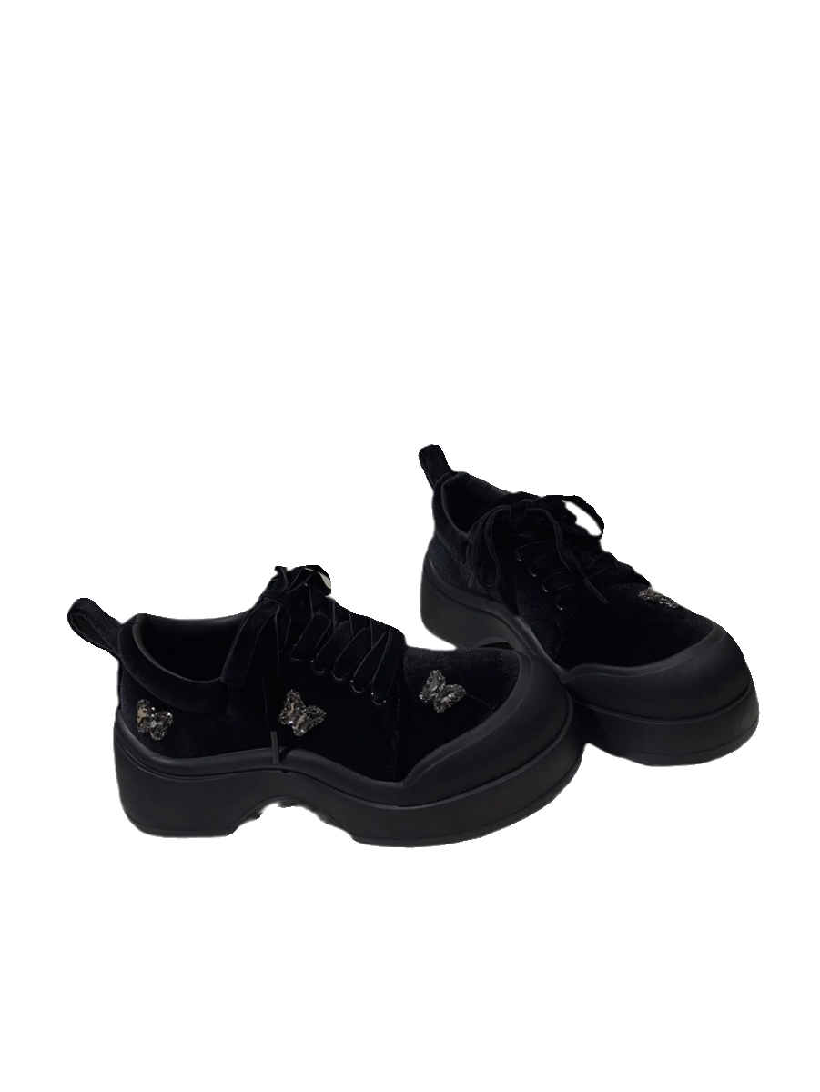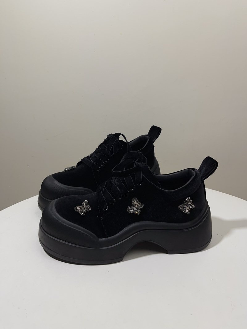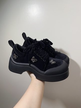 复古粗跟厚底休闲鞋加绒水钻蝴蝶