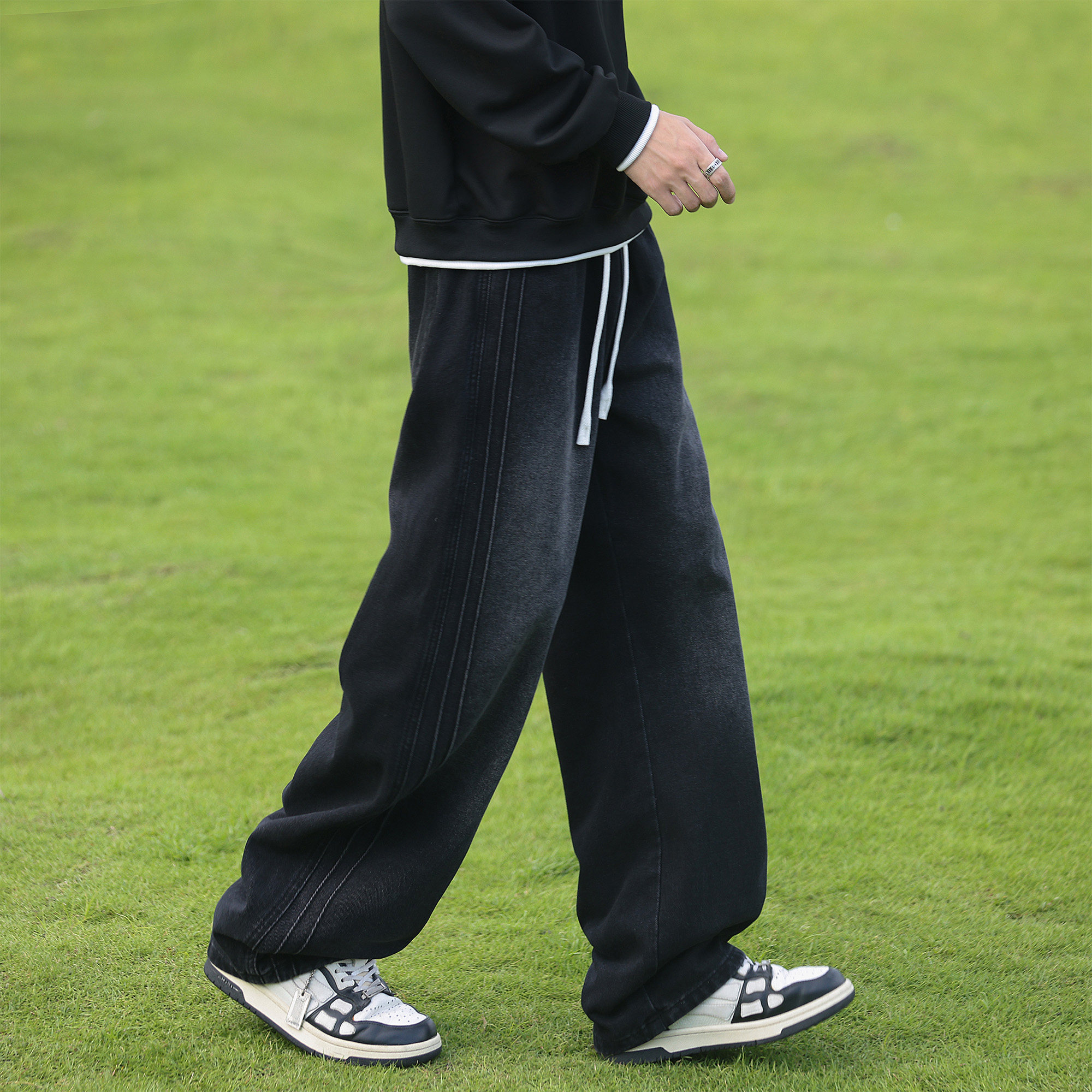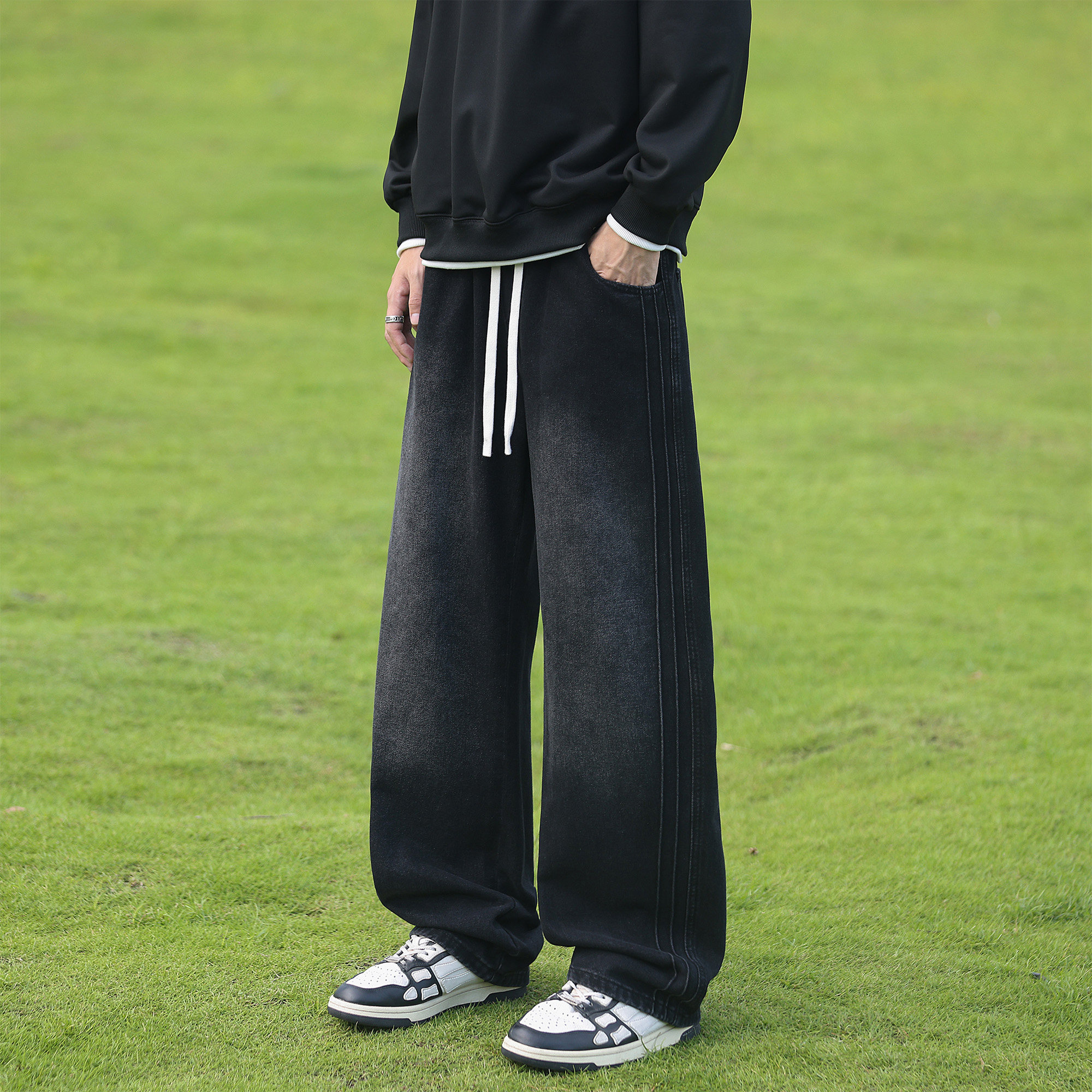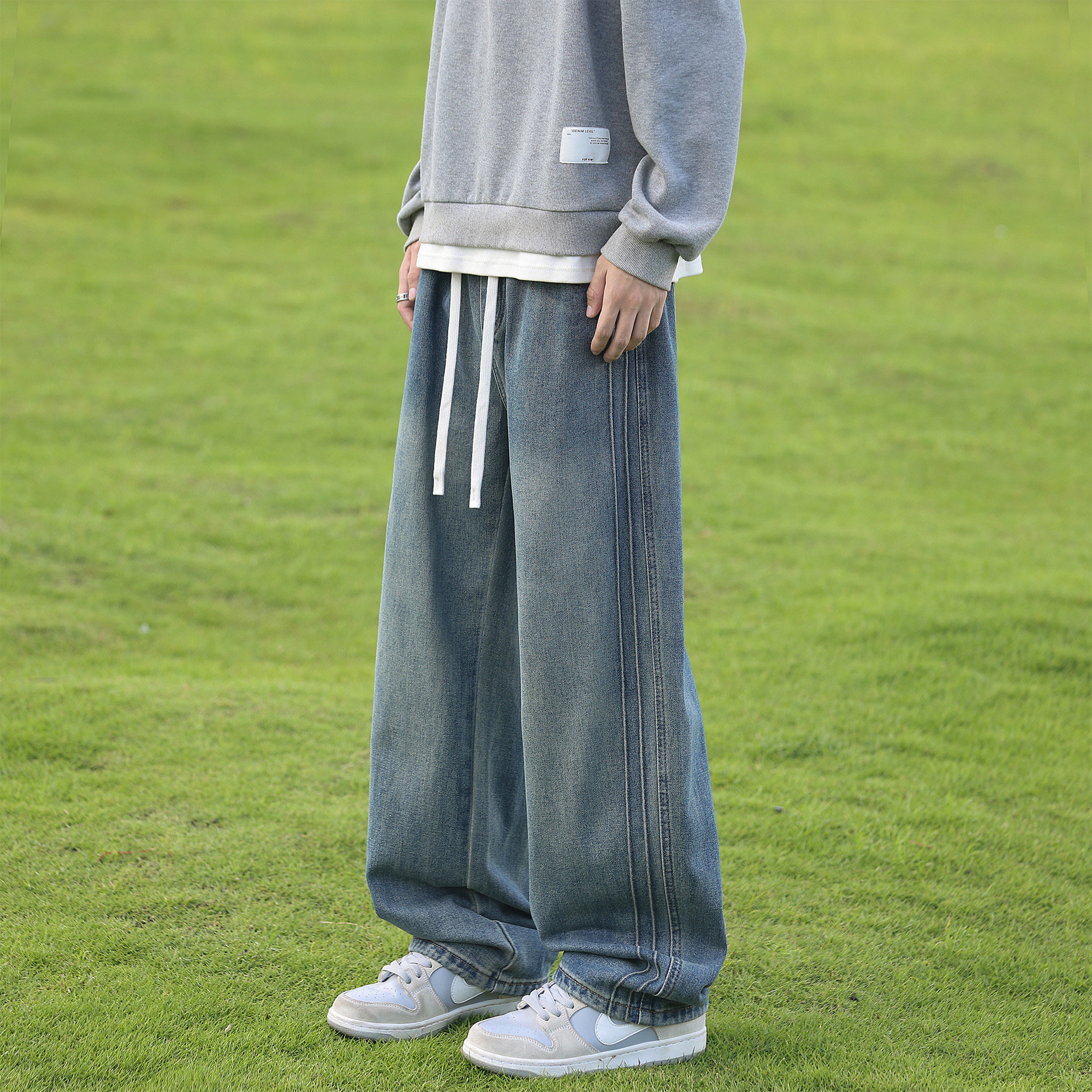 二更复古水洗抽绳牛仔裤男春秋季美式潮牌青少年男生休闲直筒长裤