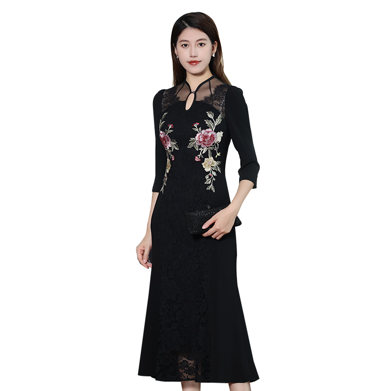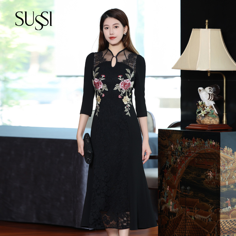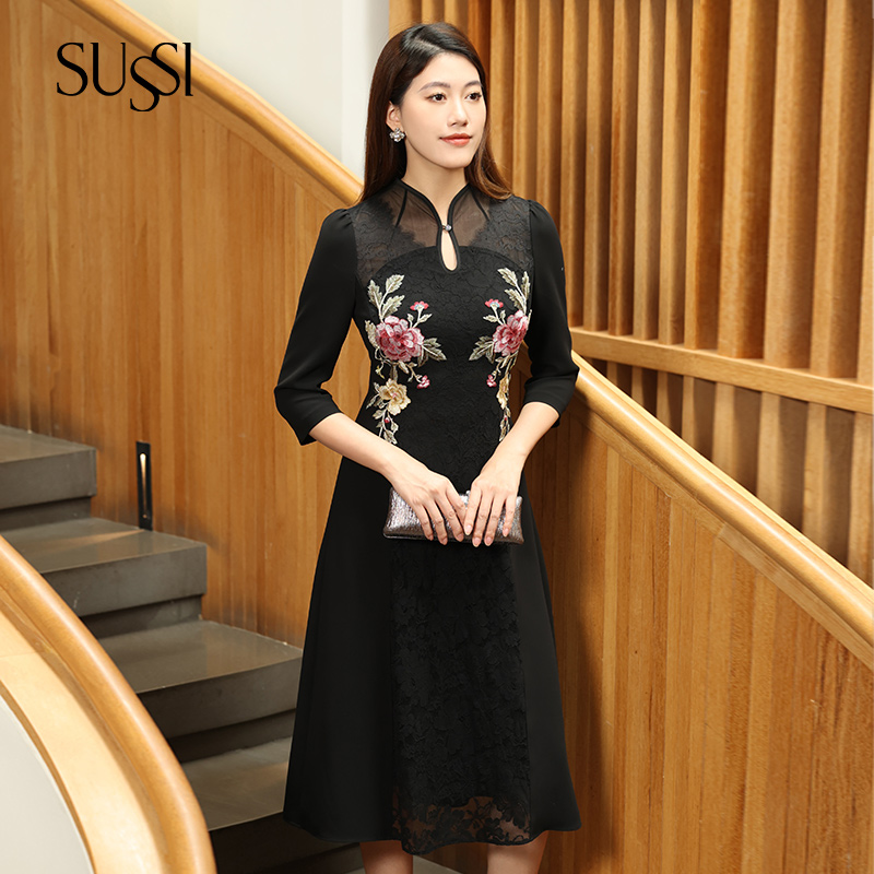 SUSSI/古色秋商场同款黑色新中式旗袍领长袖刺绣连衣裙女