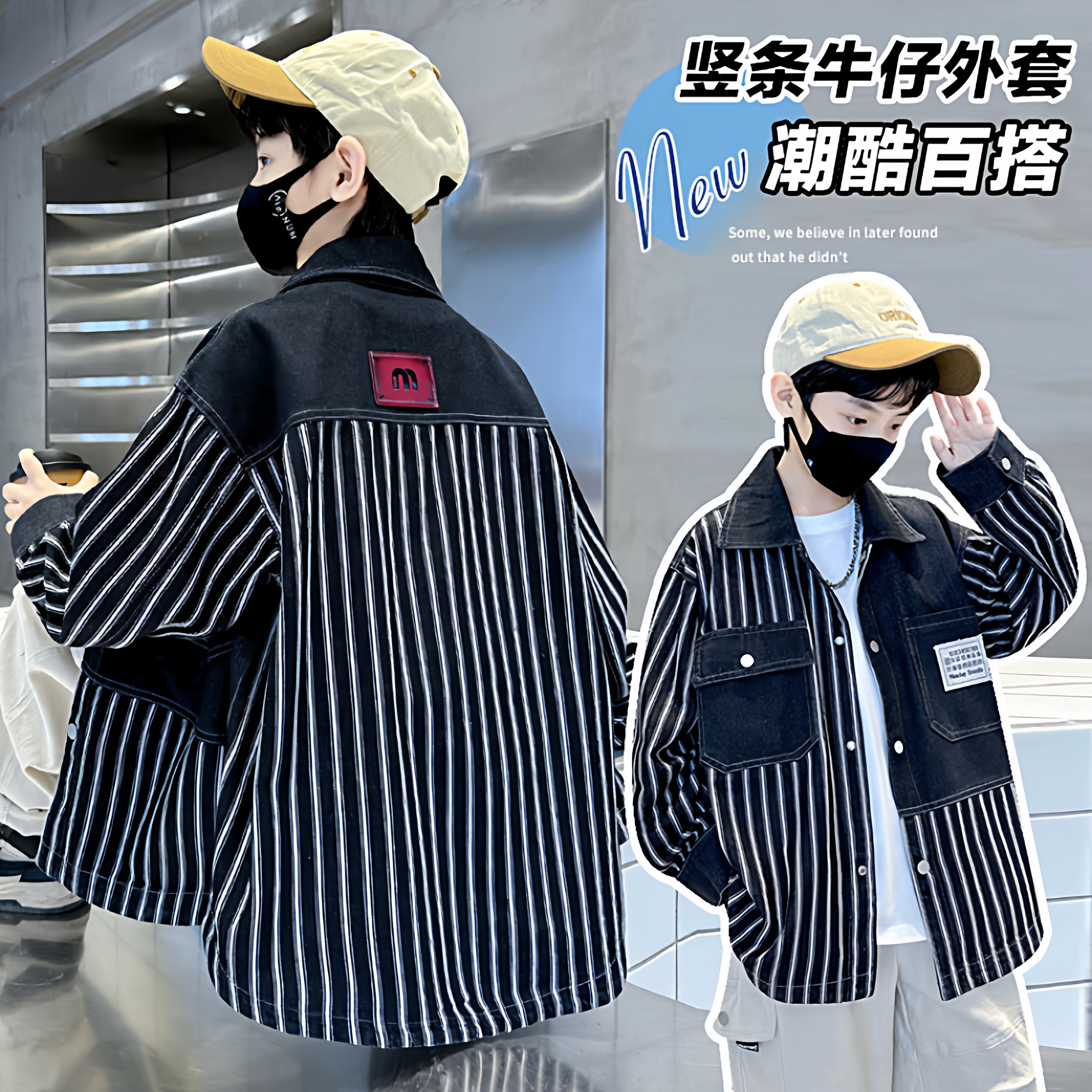 男童外套春秋款2025新款中大童潮帅气时髦长袖衬衫儿童条纹牛仔衣