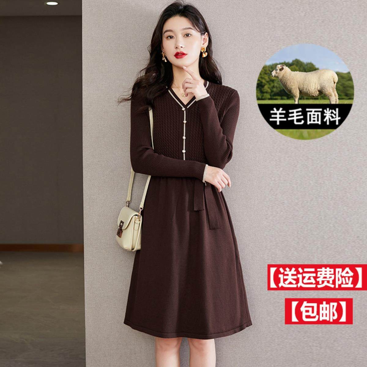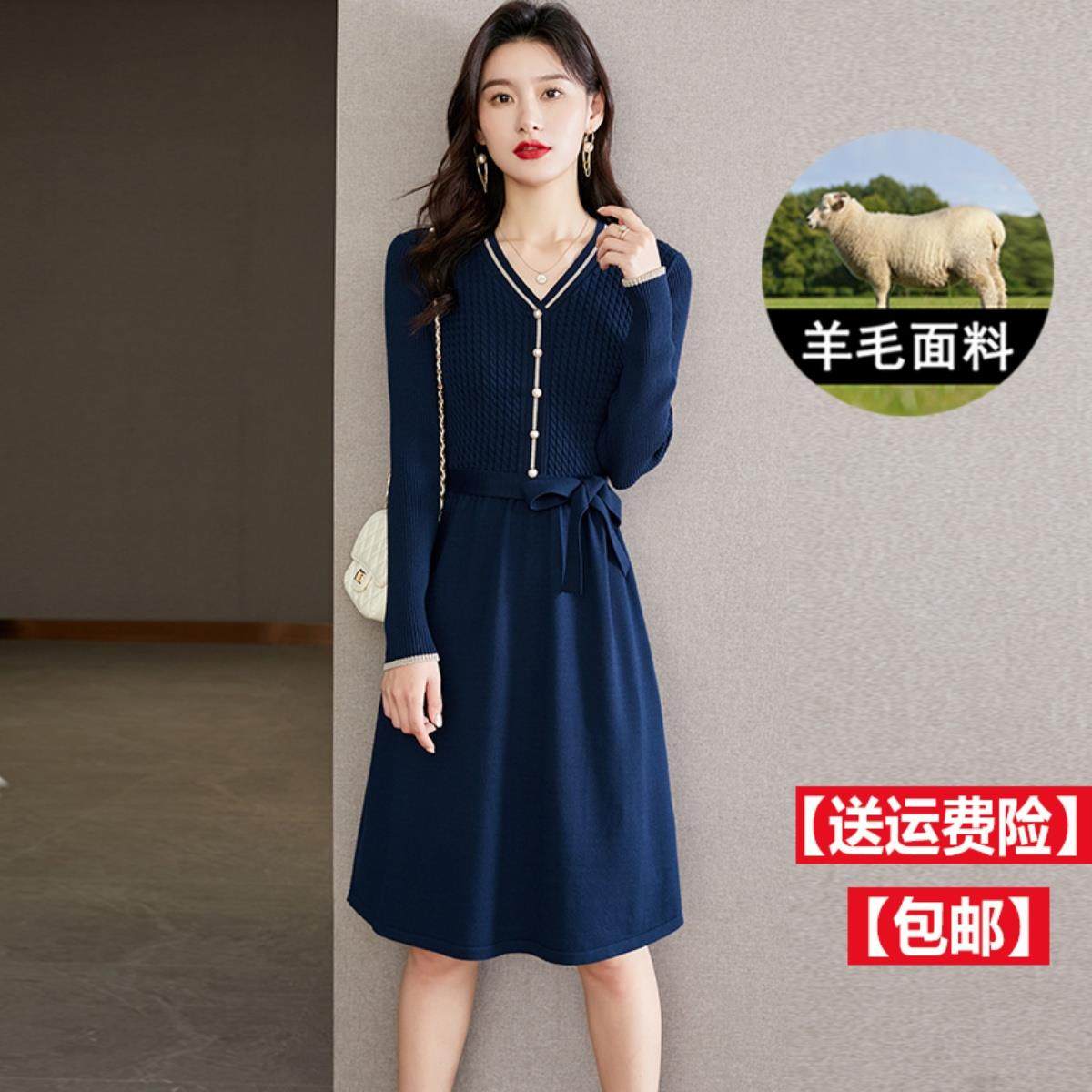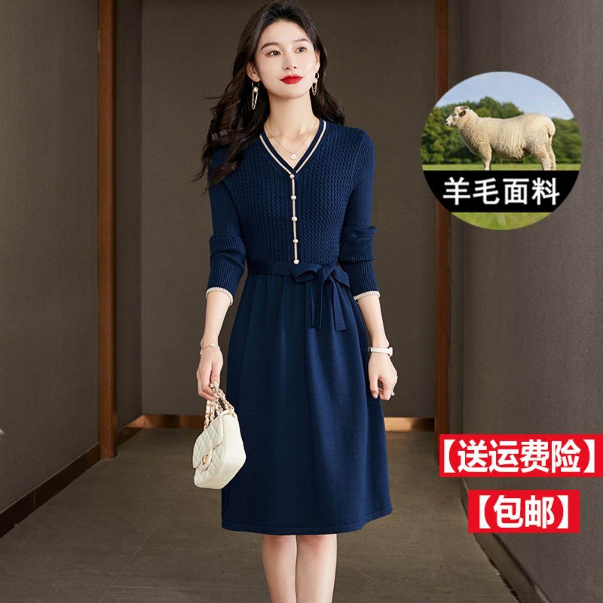 高端羊毛针织连衣裙女秋冬季新款系带收腰显瘦配大衣中长款毛衣裙