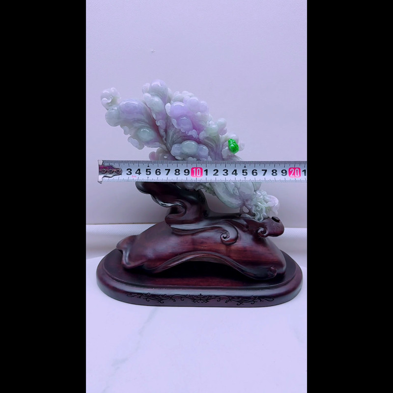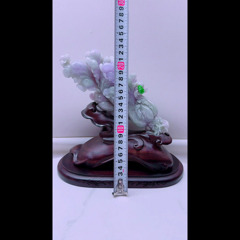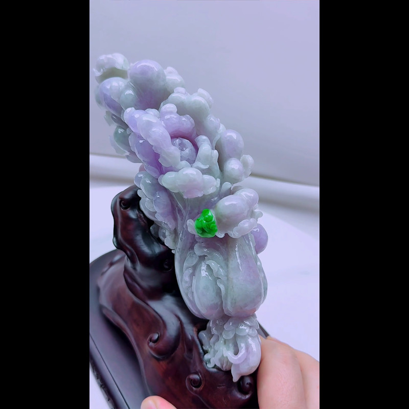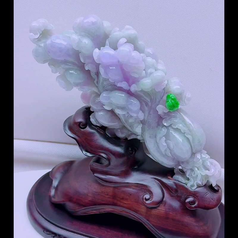 缅甸天然A货玉石翡翠孤品 精雕老坑春彩紫绿百财白菜纳百财摆件