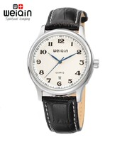 威琴经典数字石英表防水休闲真皮带男士手表黑白表盘简约日历腕表