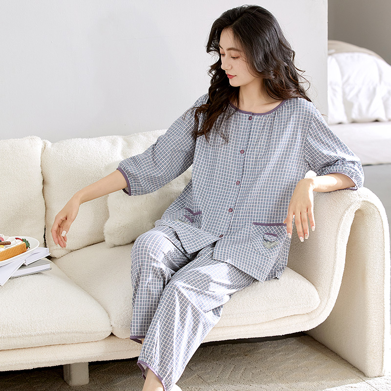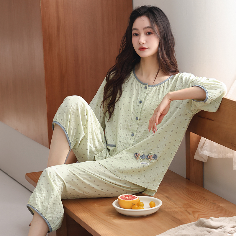 睡衣女夏季纯棉短袖九分裤新款条纹夏天女士全棉七分袖家居服套装