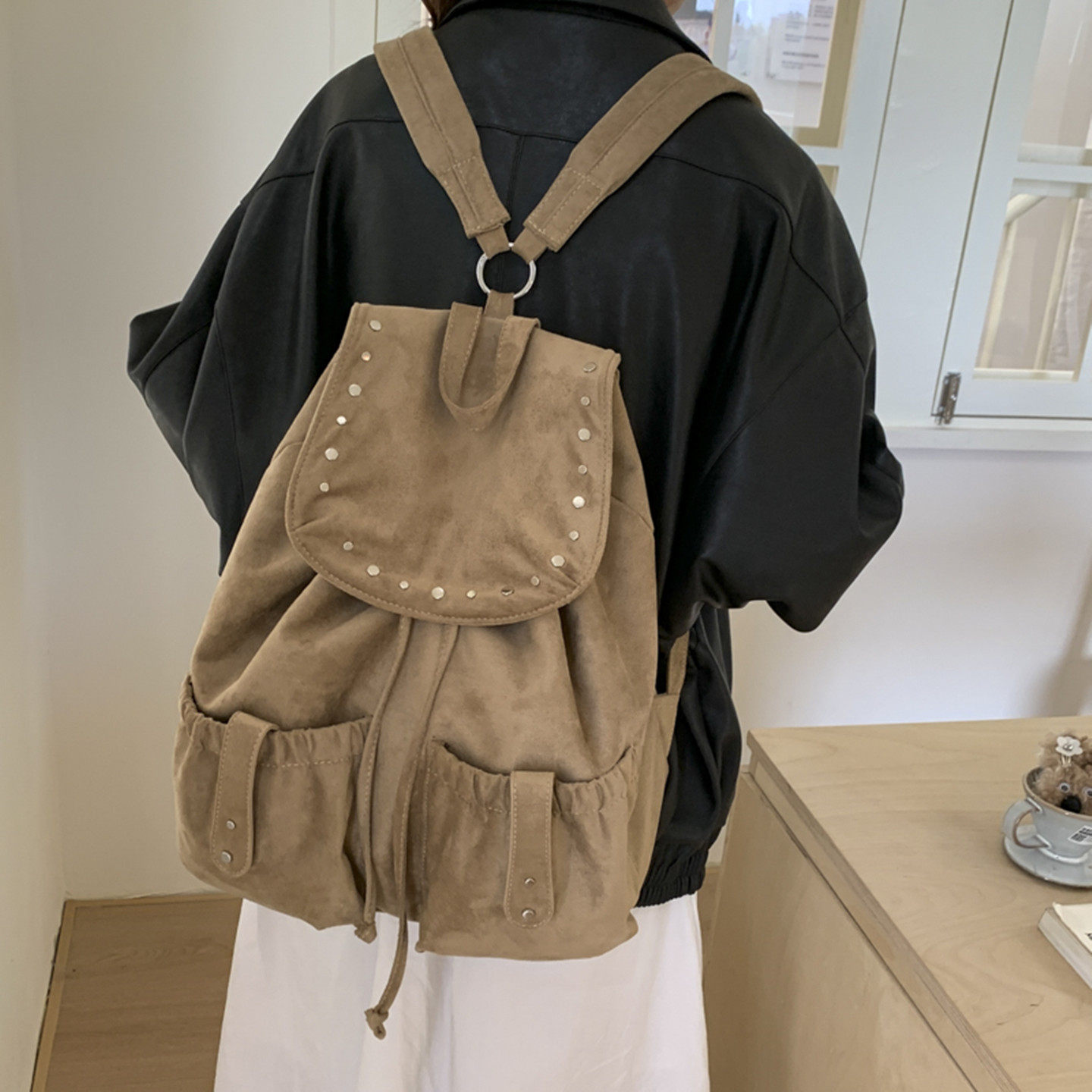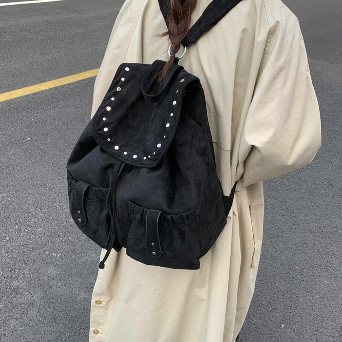 韩国上课小众复古铆钉双肩包通勤
